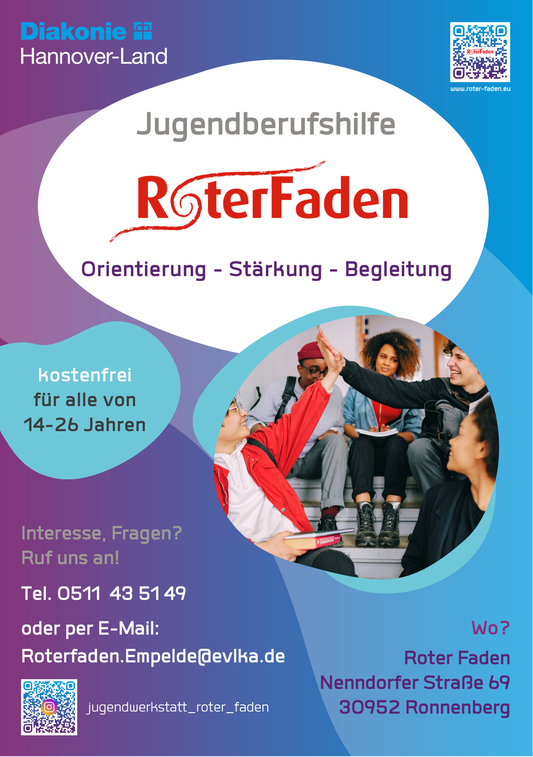 Im Kirchenkreis gibt es die Jugendwerkstatt "Roter Faden". Sie ist ein Angebot ausschließlich für Frauen, die erwerbslos sind oder sich beruflich orientieren wollen. Die Werkstatt ist in Trägerschaft des Diakonieverbandes Hannover-Land. Auf dessen Homepage finden Sie mehr Informationen zum "Roten Faden".
