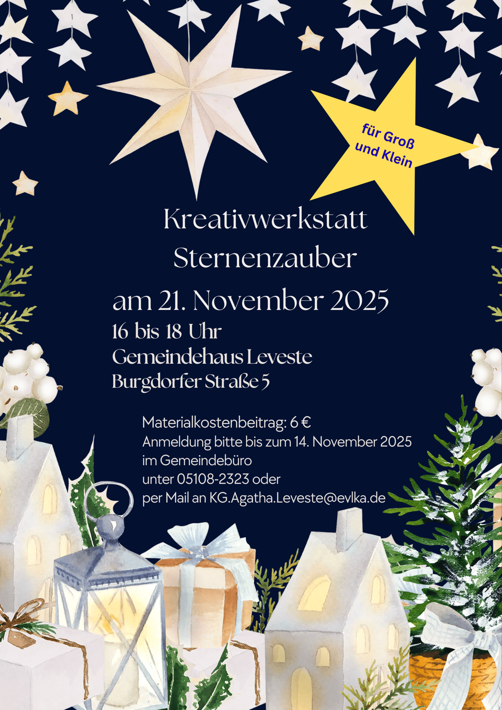 Mi, 26. November 2025 15:00 Uhr - 17:00 Uhr Büchermeile in Leveste Mi, 10. Dezember 2025 15:00 Uhr - 17:00 Uhr Büchermeile in Leveste Mi, 24. Dezember 2025 16:00 Uhr Krippenspiel am Heiligen Abend in Leveste Mi, 24. Dezember 2025 23:00 Uhr Christmette in Leveste Mi, 31. Dezember 2025 16:00 Uhr Gottesdienst in Leveste Do, 1. Januar 2026 17:00 Uhr Ökumenischer Gottesdienst in Wennigsen Terminübersichtsseite