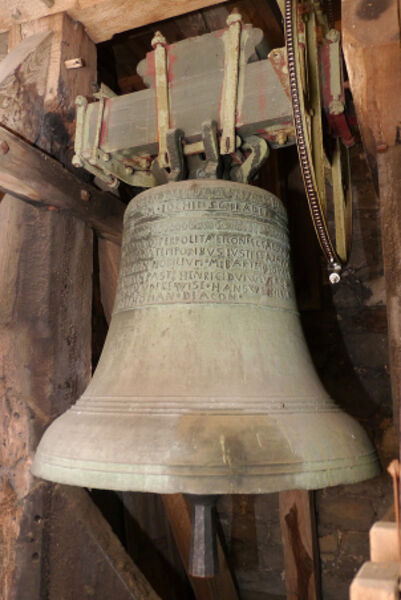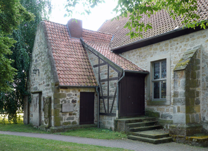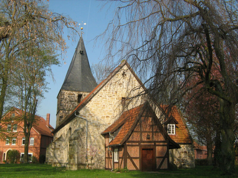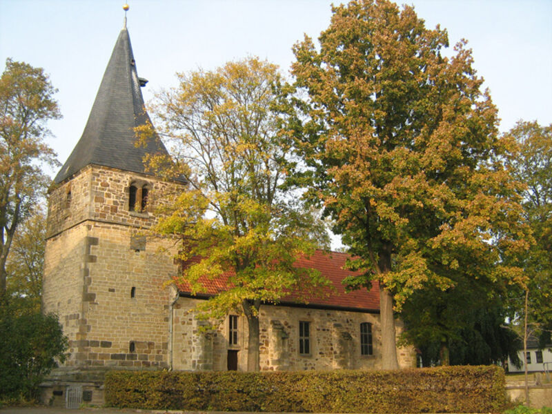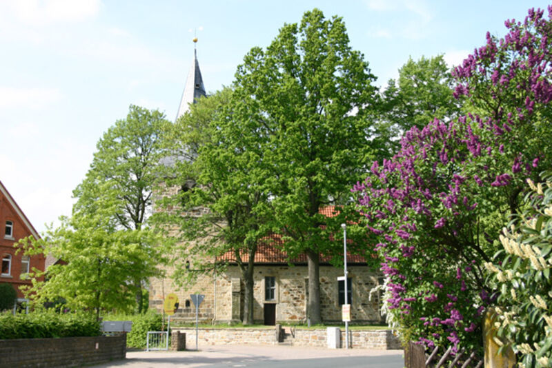 Der fast schmucklose wuchtige Westturm besitzt auf allen vier Seiten Schallöffnungen, im Norden und Süden zweigeteilt, im Westen geschmückt mit dem waagerecht liegenden alten Wappen der Freiherrn Knigge, ein schreitender Löwe. Auf der Nordseite des Turmes befindet sich, eingemauert in ein einstiges Rundbogenportal, ein recht fragwürdiges Bildwerk. Vor der Kirchen-Renovierung 1924/1925 befand es sich auf der Turmsüdseite, halb vom Erdboden verdeckt. Was mag dieses eigenartige Relief darstellen? Man erkennt oben, von links, ein Landtier, einen Vogel und einen Fisch, darunter rechts eine Ranke. Unter der Tiergruppe eine grob ausgearbeitete Figur mit Faltenrock, also eine weibliche Gestalt.