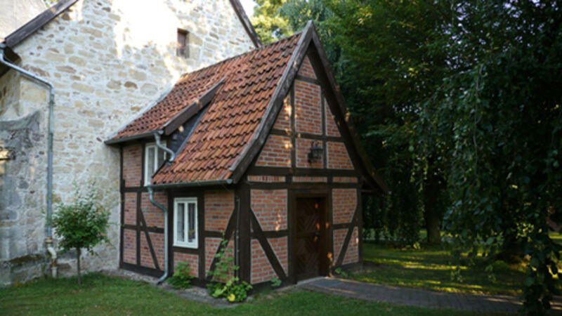 Die Sakristei duckt sich im Osten an das Langhaus der Kirche und wirkt wie ein Knusperhäuschen mit seinem Fachwerk, den bleiverglasten Scheiben und dem weit überkragenden Dach, unter dem früher Bahren aufgehängt waren. Fast wäre dieser heimelige Anbau, der das malerische Bild der Kirche besonders reizvoll abrundet, im Jahr 1950 abgebrochen worden, um hier Platz für einen größeren Heizungsanbau zu schaffen. Doch der Landeskonservator erhob Einspruch. So blieb die 1784 entstandene Sakristei erhalten.