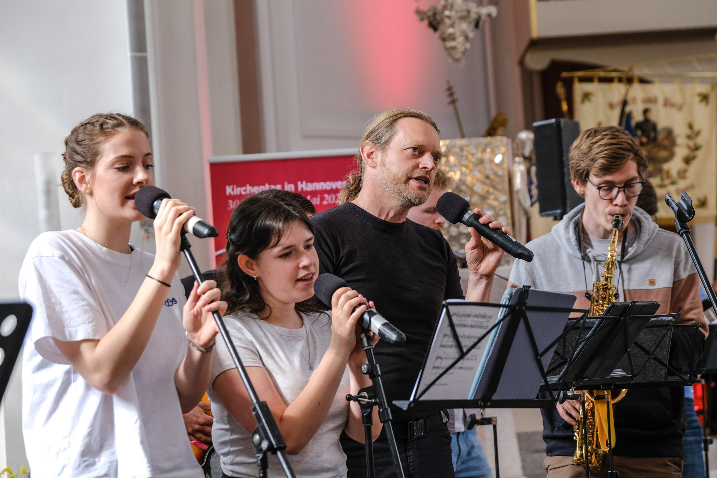Uli Harms (Piano), Ralf Heiming (Gitarre), Charlotte Harms (Gesang) und Mirja Panitz (Gesang) – beide Sängerinnen der Jugendband(e) - stimmen schwungvolle Lieder zum Ferienbeginn an. Dieses Mal reicht das Repertoire von „Griechischer Wein“, „Mit 66 Jahren“ über das obligatorische „Zwei kleine Wölfe“ bis zum gesungenen Segenslied.