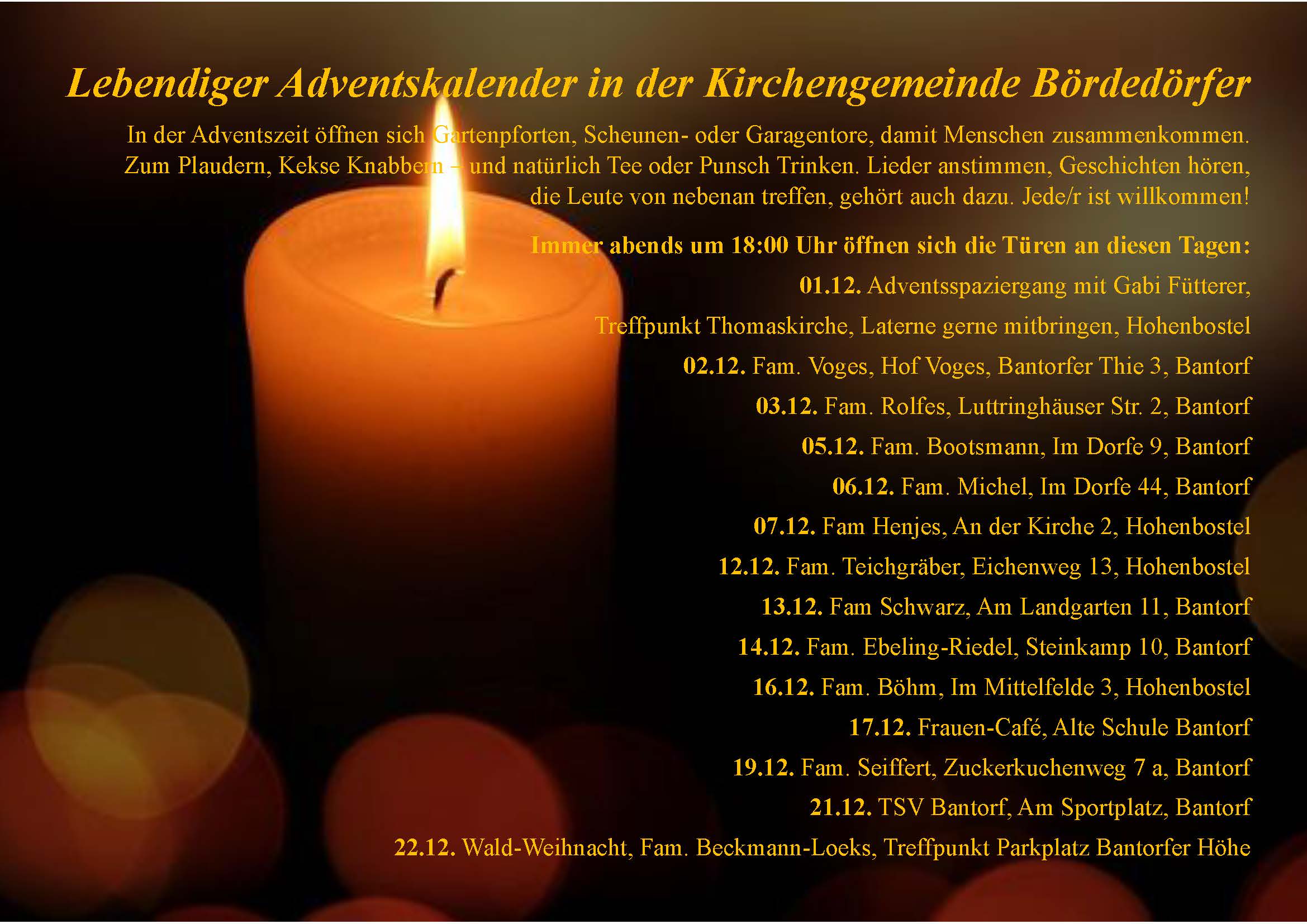 Ich lade herzlich ein zur zweiten Meditation am Samstag, den 13. Dezember 2025, von 10:00 bis 11:00 Uhr. Die Meditation bietet eine wunderbare Gelegenheit, entspannt und achtsam ins Adventswochenende zu starten. Im Anschluss gibt es ein gemütliches Beisammensein bei Tee und etwas Weihnachtsgebäck. Anmeldungen werden gerne entgegengenommen über Pastorin Elke Pankratz-Lehnhoff: elke.pankratz-lehnhoff@evlka.de.
