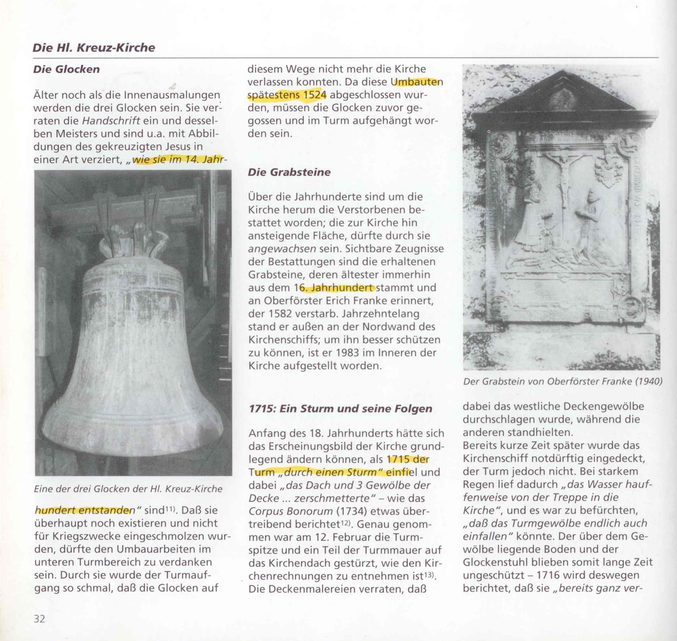 Im Turm befinden sich drei Glocken aus dem 14. Jahrhundert, die vermutlich wegen des schwierigen Abtransport den Einschmelzungsaktionen beider Weltkriege entgangen sind.