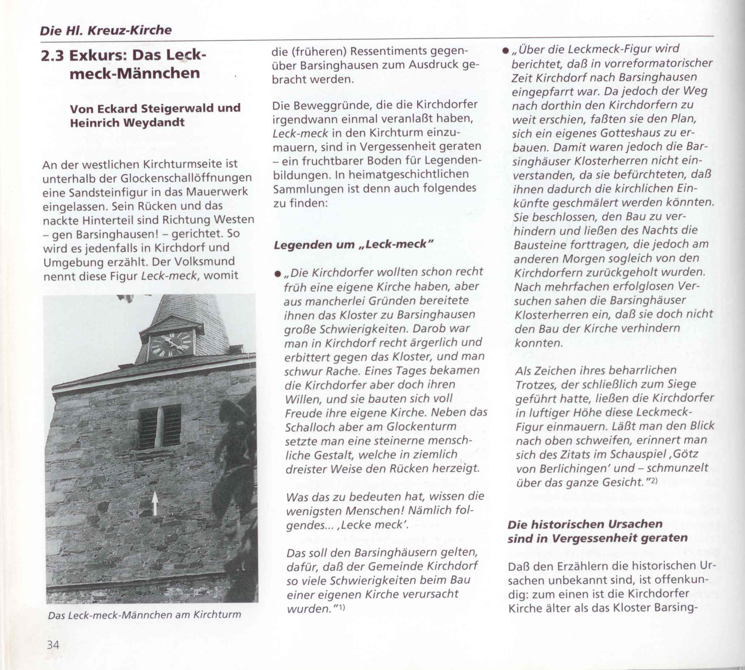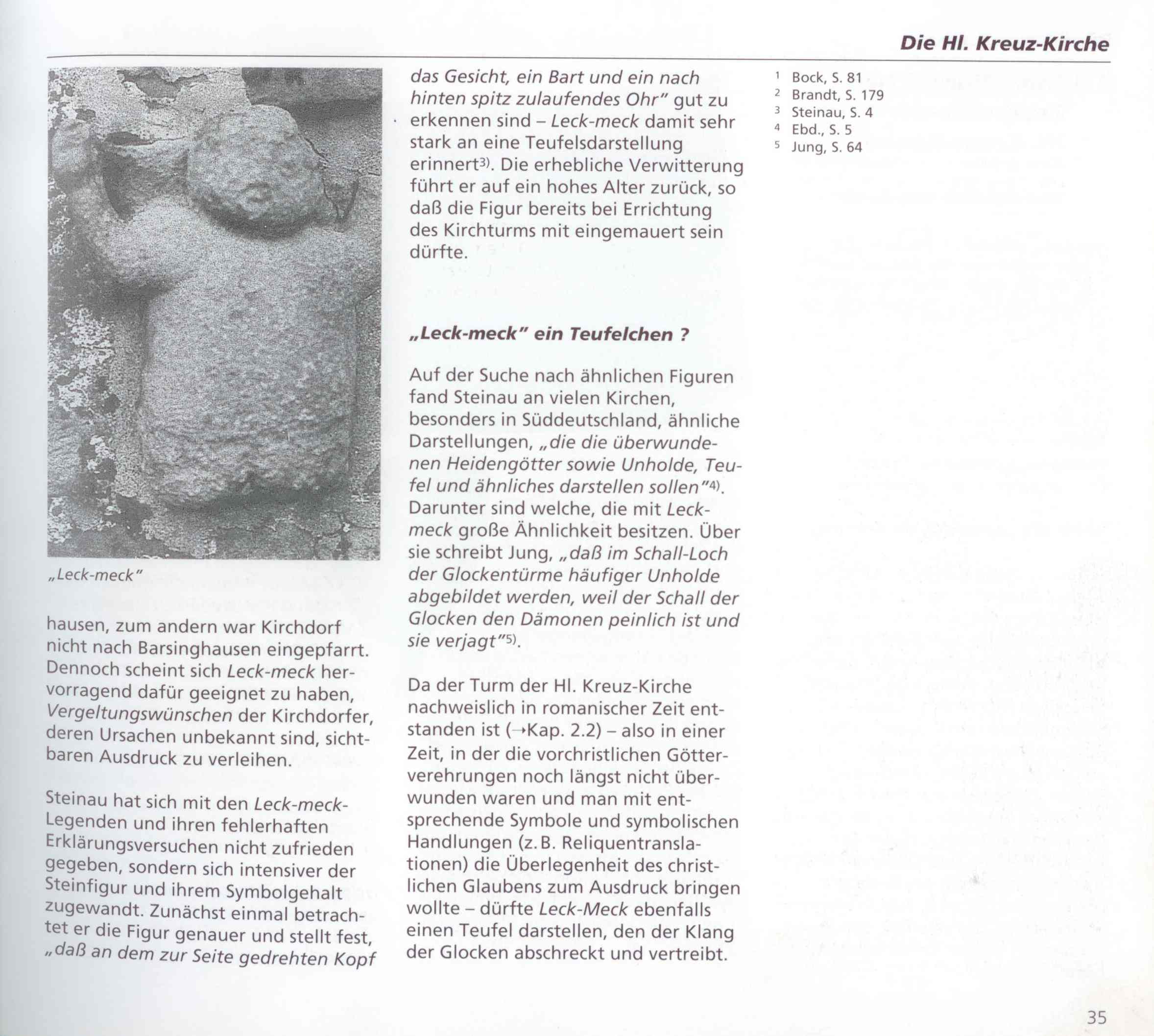 Etwas höher über dem Eingang entdeckt man eine Figur, die das bloße Hinterteil in Richtung Barsinghausen ausstreckt. Es ist die sogenannte „Leckmeck-Figur“, sichtbares Zeichen für die streitbaren Kirchdorfer, die ihren Groll oft gegen die Barsinghäuser richten.