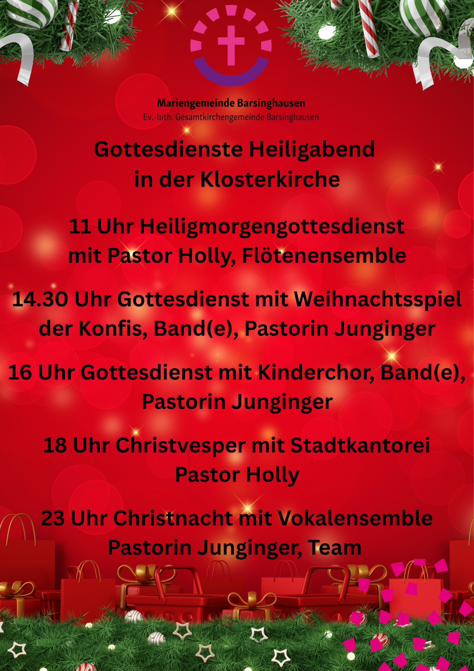 * Mittwoch, 31.12., 17 Uhr Festgottesdienst zum Jahresabschluss mit Pastorinnen Uta Junginger und Kristin Köhler, Segnung und Musik: Querflöte Gerald Pursche und Orgel Ole Magers