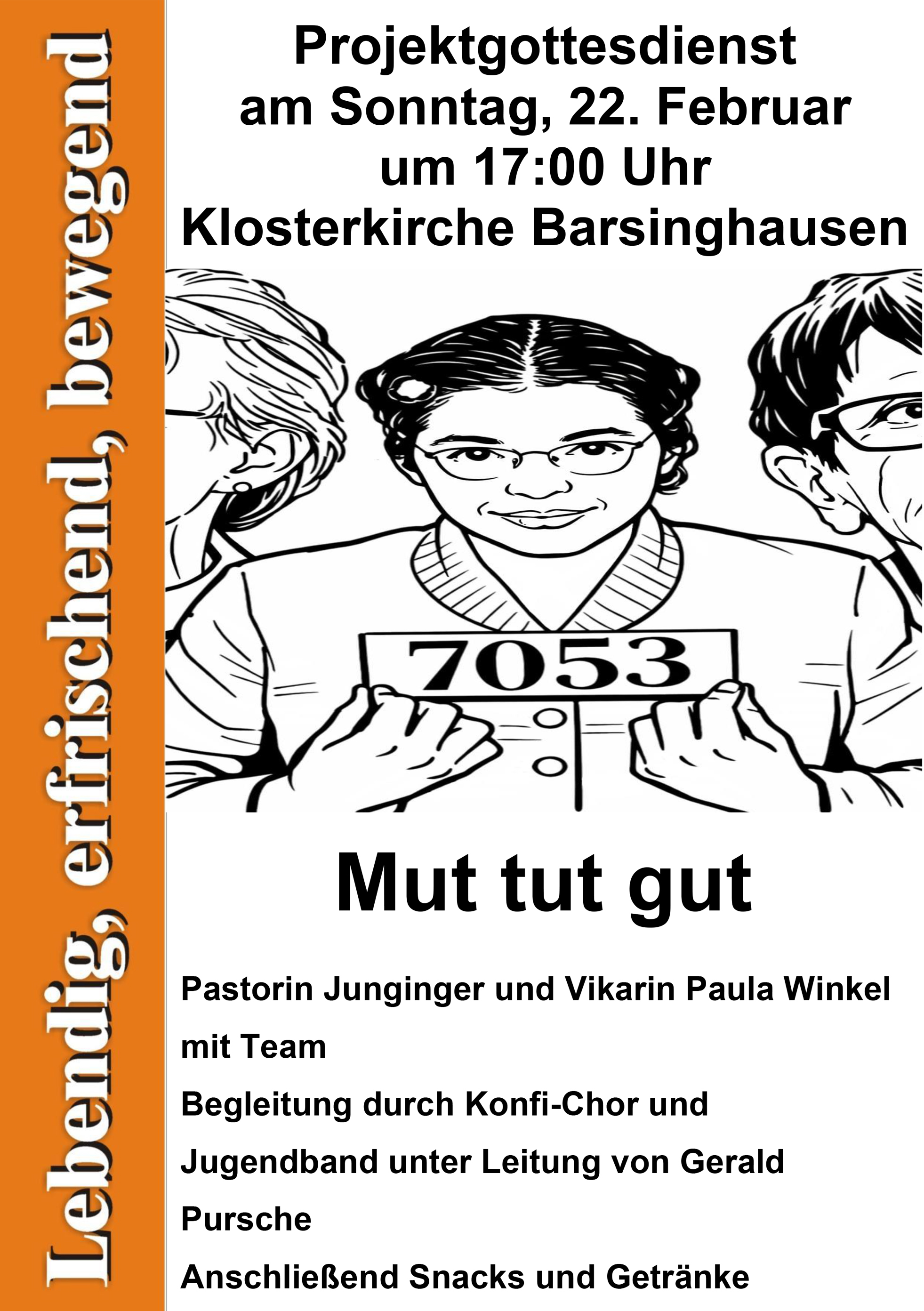 * Sonntag, 22. Februar, 17 Uhr Projektgottesdienst mit Jugendband(e), Pastorin Junginger, Vikarin Winkel und Team, anschl. Snacks und Getränke
