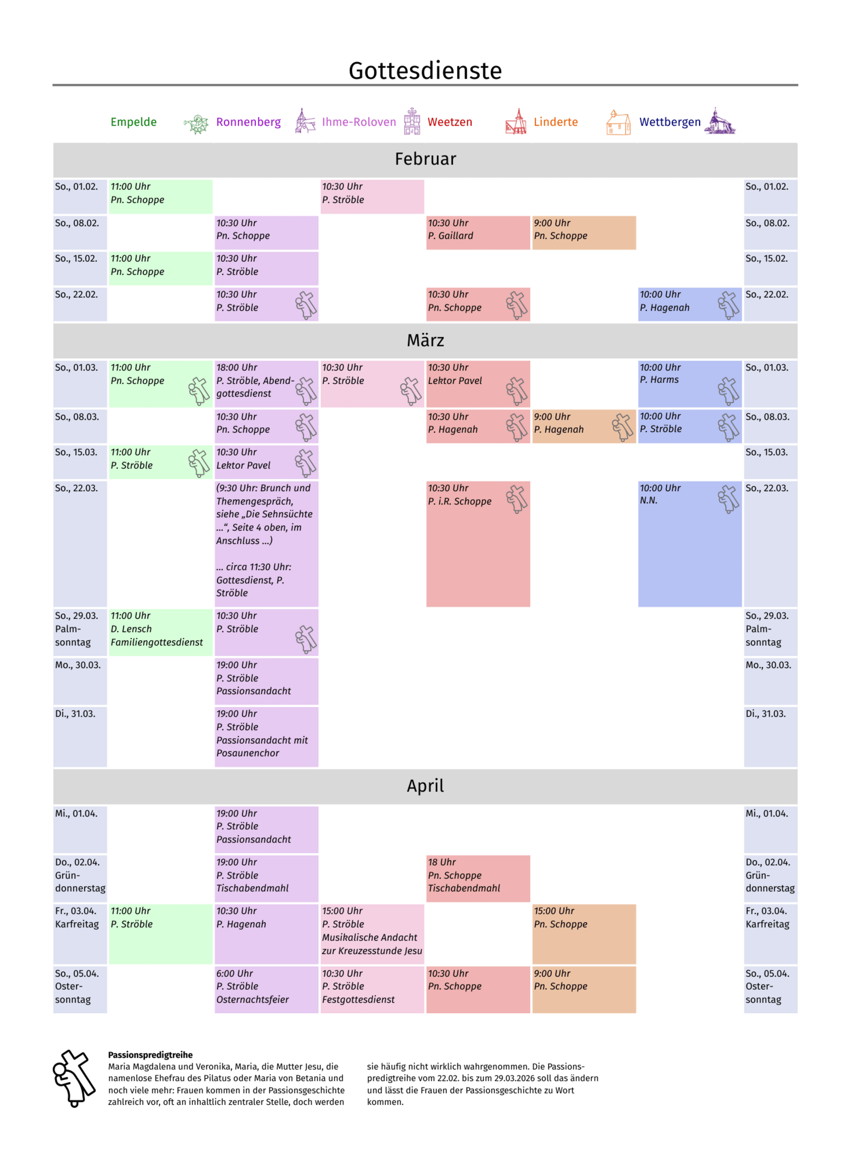 Aktuell finden die Gottesdienste im Gemeindehaus (Am Kirchhofe 4d) statt und die Friedensgebete in der Michaeliskirche (Am Kirchhofe, 30952 Ronnenberg).