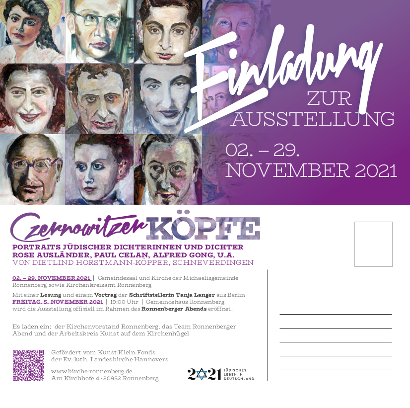 Die Künstlerin Dietlind Horstmann-Köpper aus Schneverdingen hat in den letzten Jahren etliche dieser Dichterinnen und Dichter in eindrucksvollen Malereien portraitiert. Die Ausstellung, die im derzeitigen Festjahr 1700 Jahre jüdisches Leben in Deutschland bereits bundesweit Beachtung gefunden hat, erinnert somit an wichtige Stimmen der deutschen Literatur, die jüdischen Menschen gehörten.