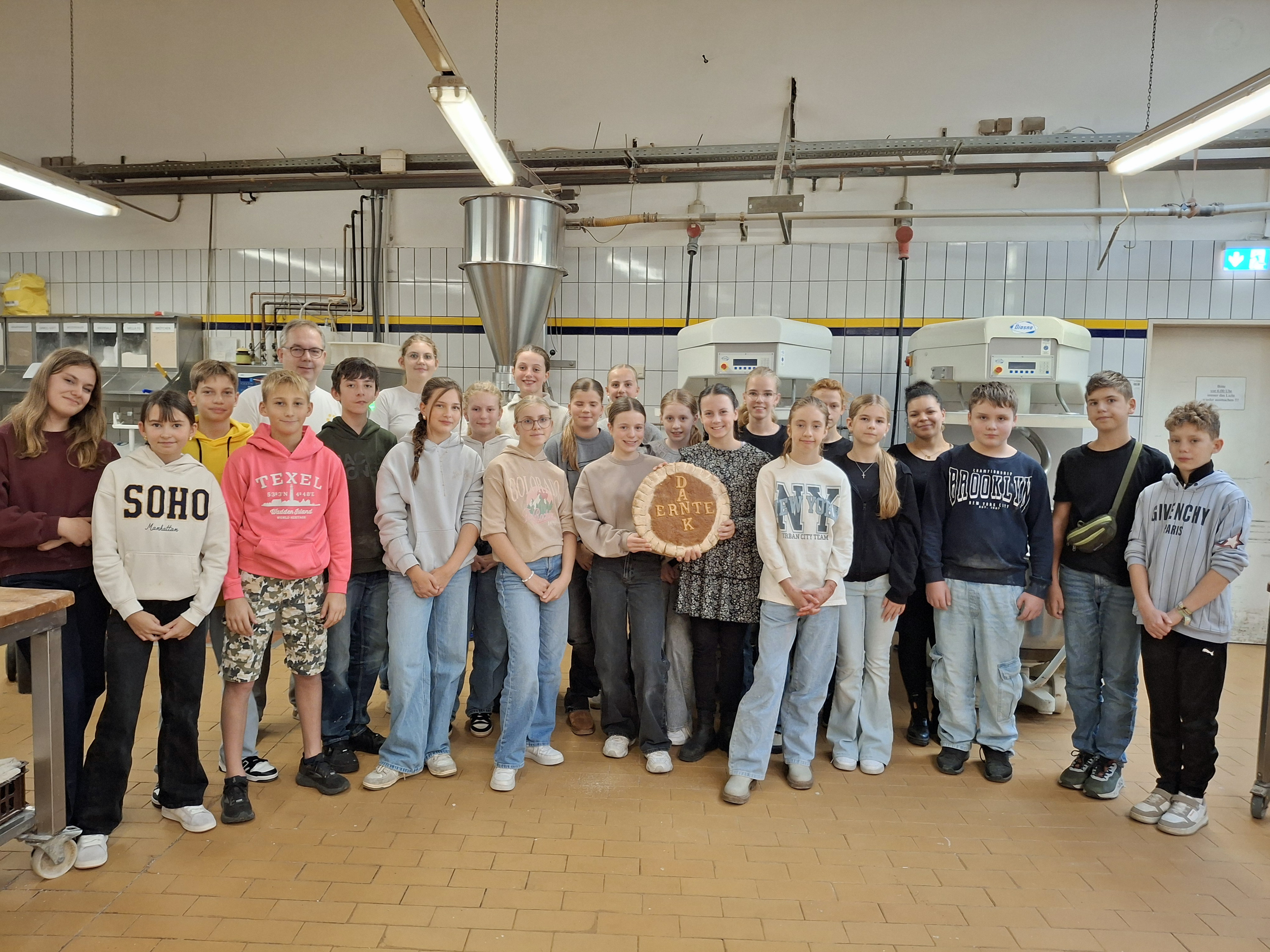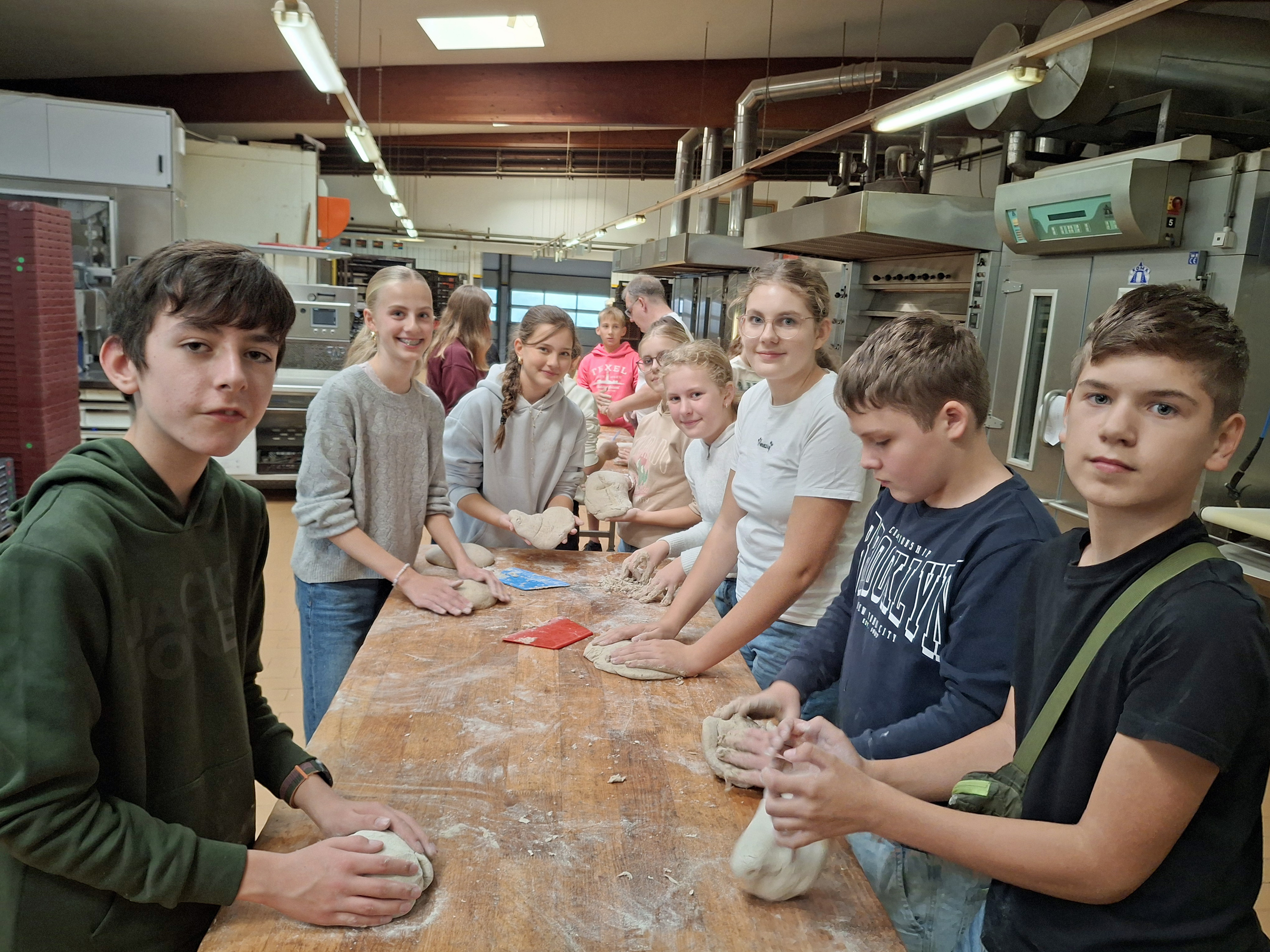 Die 23 Vorkonfis besuchten am Donnerstag die Bäckerei Hünerberg. Dort buken sie unter Anleitung von Bäckermeister Hendrik Mordfeld 44 Brote. Seit 15 Jahren schon gibt es diese tolle Zusammenarbeit zwischen der Bäckerei und der Mariengemeinde. Hendrik Mordfeld zeigte in launiger Weise den Konfis, welche Zutaten für Brote benötigt werden. Uta Junginger dankte dem Bäckermeister herzlich für seine Zeit, seinen großartigen Einsatz sowie die großzügige Spende der Brote – für Brot für die Welt.