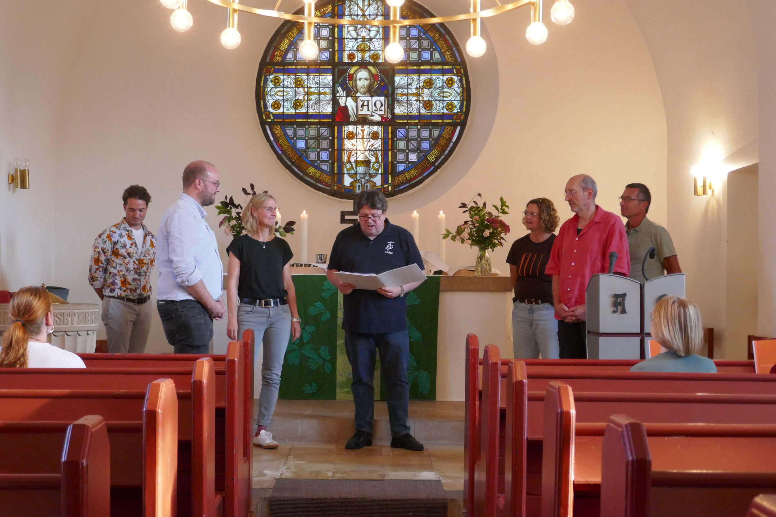 Seit Anfang des Monats ist Philipp Lerke als Diakon im Kirchenkreis Ronnenberg mit Schwerpunkt in der Arbeit mit Konfirmand*innen und dem Kirchenkreisjugenddienst (KJD) tätig. Damit geht er neue Wege in seiner beruflichen Arbeit, die ihn bisher nach Altwarmbüchen und Wettmar führte. Sozusagen ziehe er auch ein neues Gewand an – anknüpfend eine Passage aus dem Epheserbrief der Bibel. Und so zog sich das Gedankenspiel eines neuen Gewandes durch den Einführungsgottesdienst für Philipp Lerke am Sonntag, 22. September, in der Christuskirche in Egestorf. Deutlich wurde auch die Freude über einen neuen Kollegen. „Es ist schön, dass du dich traust, etwas neues anzufangen“, meinte Kirchenkreisjugendpastorin Kristin Köhler, die zusammen mit Sebastian Kühl, Pastor in gleicher Funktion im Kirchenkreis die Feier zusammen mit Mitgliedern der Evangelischen Jugend gestaltete. Sie interviewte Philipp Lerke, um ihn gleichzeitig der vor allem jugendlichen Gemeinde vorzustellen. Das besondere an der Evangelischen Jugend sei für ihn, dass hier jeder und jede willkommen sei und sich zugehörig fühlen können, in aller Vielfalt. Das habe sich für ihn auch zum Beispiel Anfang des Jahres bei den Demos gegen Rechts in Hannover gezeigt, bei denen er auch viele Aktive aus der Evangelischen Jugend getroffen habe. Nach dem Segen für Philipp Lerke für seine neuen Aufgaben sprach Kirchenkreisjugendwart Helge Bechtloff im Kreis der Kolleg*innen ein Grußwort und überreichte einen Rucksack mit hilfreicher Füllung für künftige Freizeiten und Veranstaltungen. „Es ist schön, dass du da bist“, machte er deutlich und freute sich über die Wiederbegegnung mit dem 38-Jährigen, der schließlich vor gut 10 Jahren seine ersten beruflichen Schritte damals im Anerkennungsjahr als Diakon im KJD ging.