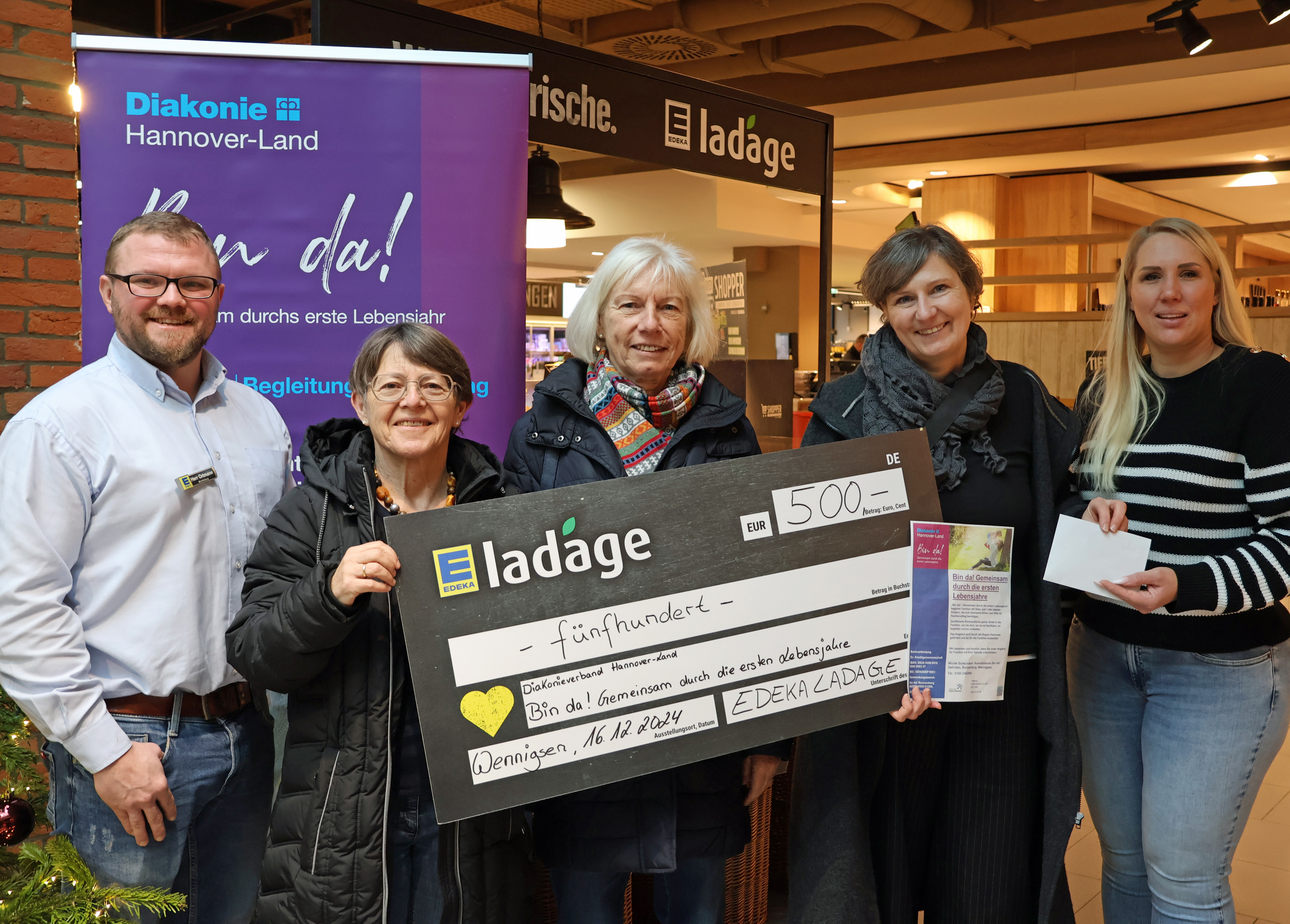 Noch eine gute Woche bis Weihnachten - Zeit der Geschenke und der frohen Überraschungen. Und so überreichten am Montag, 16. Dezember, der Edeka Ladage-Marktleiter Viktor Ortmann und die Assistenz der Geschäftsführung, Sarah Bretschneider, im Markt in Wennigsen eine 500 Euro-Spende an das Projekt "Bin da! - Hilfe in den ersten Lebensjahren". Koordinatorin Nicole Scheumann und die beiden Ehrenamtlichen Karin Wüppen und Karin Behling nahmen die Spende entgegen. Ein gutes Vierteljahr konnten Kundinnen und Kunden von Ladage in Wennigsen auf die Einlösung von Pfandbons verzichten und diese in dafür vorgesehene Kästen an der Leergutannahme werfen. „Es ist einfach schön, zu sehen, wie durch kleine Spenden dann eine wirksame Summe zusammenkommt. Wir bedanken uns sehr bei der Marktleitung, die unsere Anfrage aufgegriffen hat und bei den Spenderinnen und Spendern“, sagte Nicole Scheumann. Die Spende fließt in das Projekt „Bin da“ des Diakonieverbandes Hannover-Land in Wennigsen, Gehrden und Ronnenberg. Stützen des Projektes sind die fast 20 Ehrenamtlichen, die regelmäßig Familien mit kleinen Kindern bis zum Alter von sechs Jahren besuchen und diese allein schon dadurch entlasten, indem sie ein offenes Ohr für sie haben und mit den Kindern Zeit verbringen, so dass die Eltern auch mal „durchatmen“ können. Den Ehrenamtlichen selbst bietet „Bin da!“ die Möglichkeit von Fortbildungen, zu denen sie sich regelmäßig treffen. Hinzu kommen auch Angebote für Eltern.