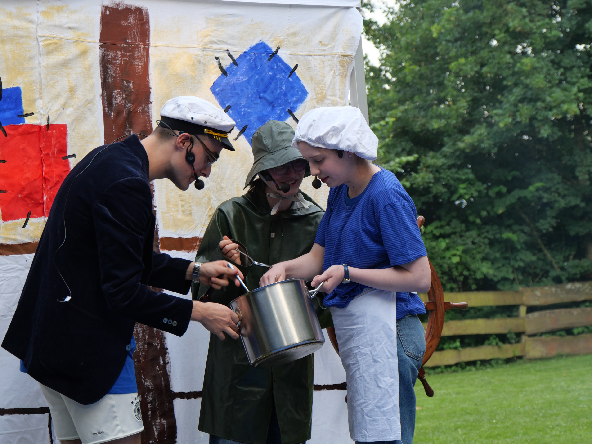 Die Acht- bis Zwölfjährigen bezogen ihre insgesamt dreizehn Zelte und lernten die Teamenden sowie das Jugendcamp kennen. So füllte sich der Zeltplatz immer mehr mit Leben und eine bunte, maritime Welt entstand. „Leinen los wir sind bereit! Meine Crew die gibt mir halt!“ schalte es nun in der Morgenrunde, begleitet auf der Gitarre von Martin Wulf-Wagner, über den Zeltplatz. „An jedem Tag erlebten die Kinder im täglichen Theaterstück die Abenteuer des Kapitäns Fred, seiner Crew und vielen bunten Unterwassertieren.