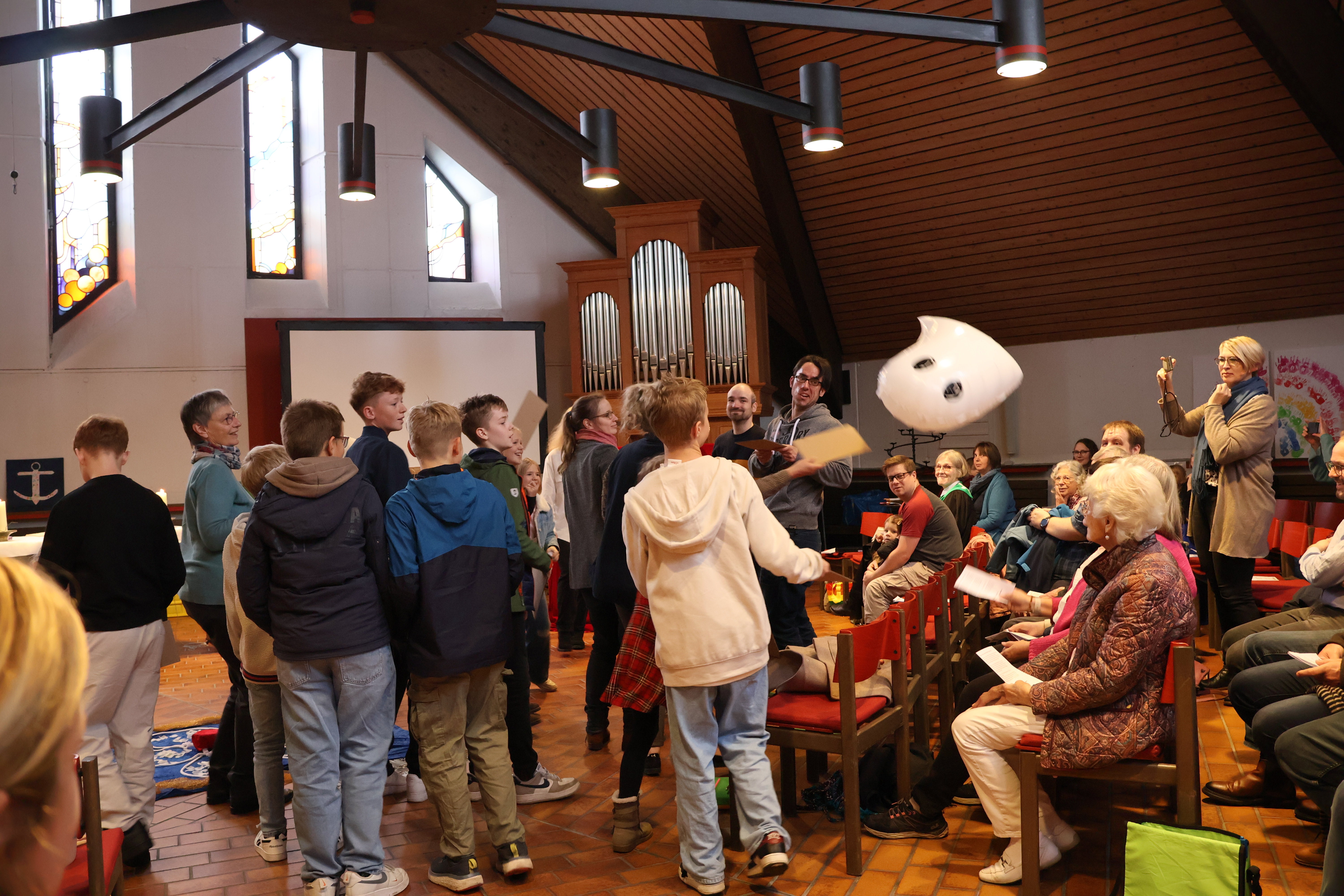 Im Familiengottesdienst gab es viele kreative Mitmachmöglichkeiten, Lieder mit viel Bewegung und mit Hilfe der Kinder wurden auch die angstmachenden Geister aus der Kirche vertrieben – schließlich hatte schon Martin Luther erkannt: „Gott liebt uns so, wie wir sind!“