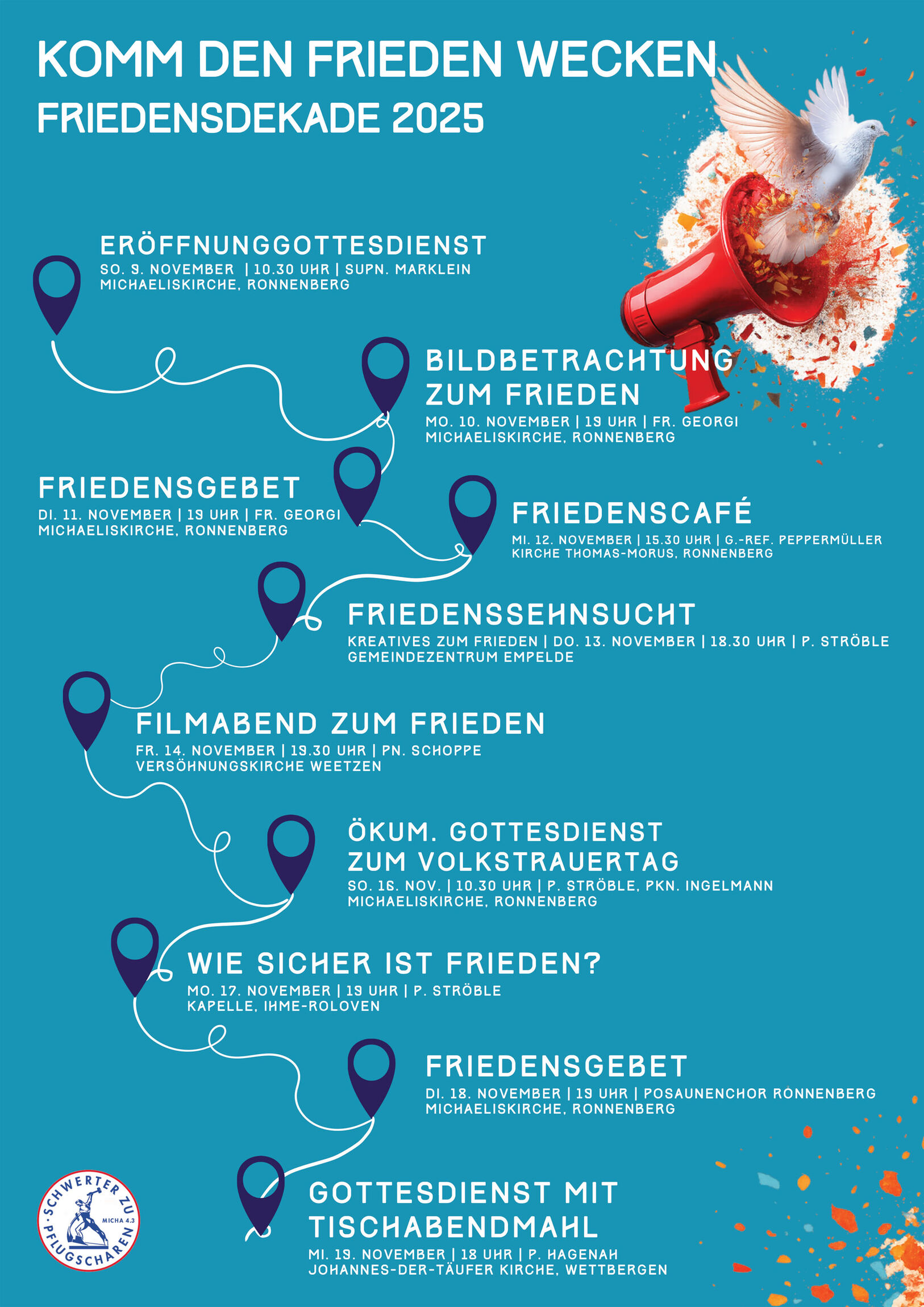 Die FriedensDekade hat eine lange Tradition: Seit den 1980er-Jahren verbindet sie Kirchengemeinden, Schulen und Initiativen bundesweit. 2025 steht das Motto im Zeichen des 80. Jahrestags des Endes des Zweiten Weltkriegs – eine Mahnung, dass Frieden nicht selbstverständlich ist, sondern täglich erkämpft werden muss. Auch im Kirchenkreis Ronnenberg beteiligen sich die Gemeinden in der Region Ronnenberg in Kooperation mit der katholischen Gemeinde daran.