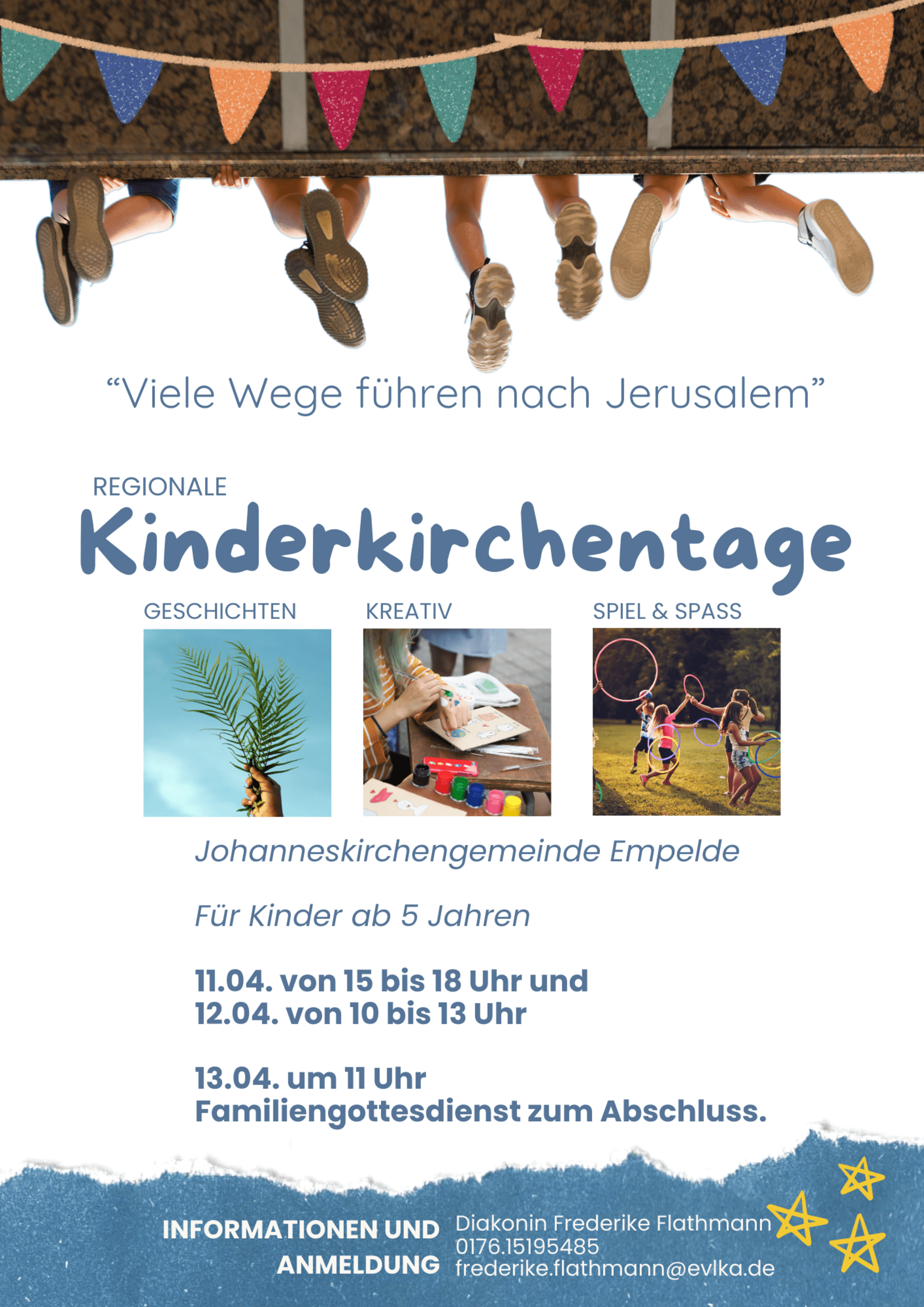Die Johanneskirchengemeinde Empelde lädt alle Kinder ab fünf Jahren zu den spannenden Kinderkirchentagen ein! Dieses Jahr steht das Thema "Viele Wege führen nach Jerusalem" im Mittelpunkt. An zwei ereignisreichen Tagen, dem 11. April von 15 bis 18 Uhr und dem 12. April von 10 bis 13 Uhr, erwartet die Kinder ein buntes Programm voller Geschichten, kreativer Aktivitäten und Spiel & Spaß.