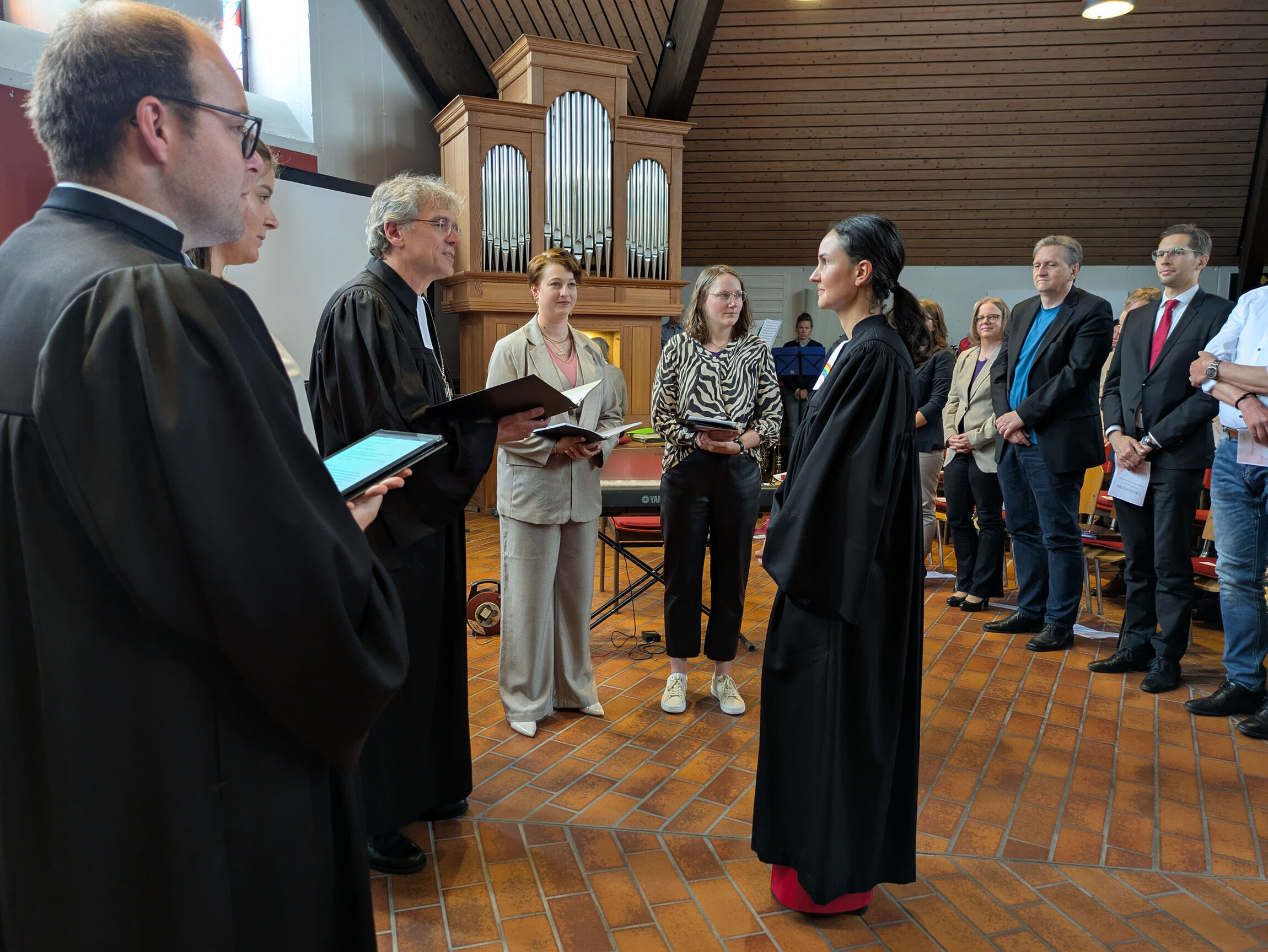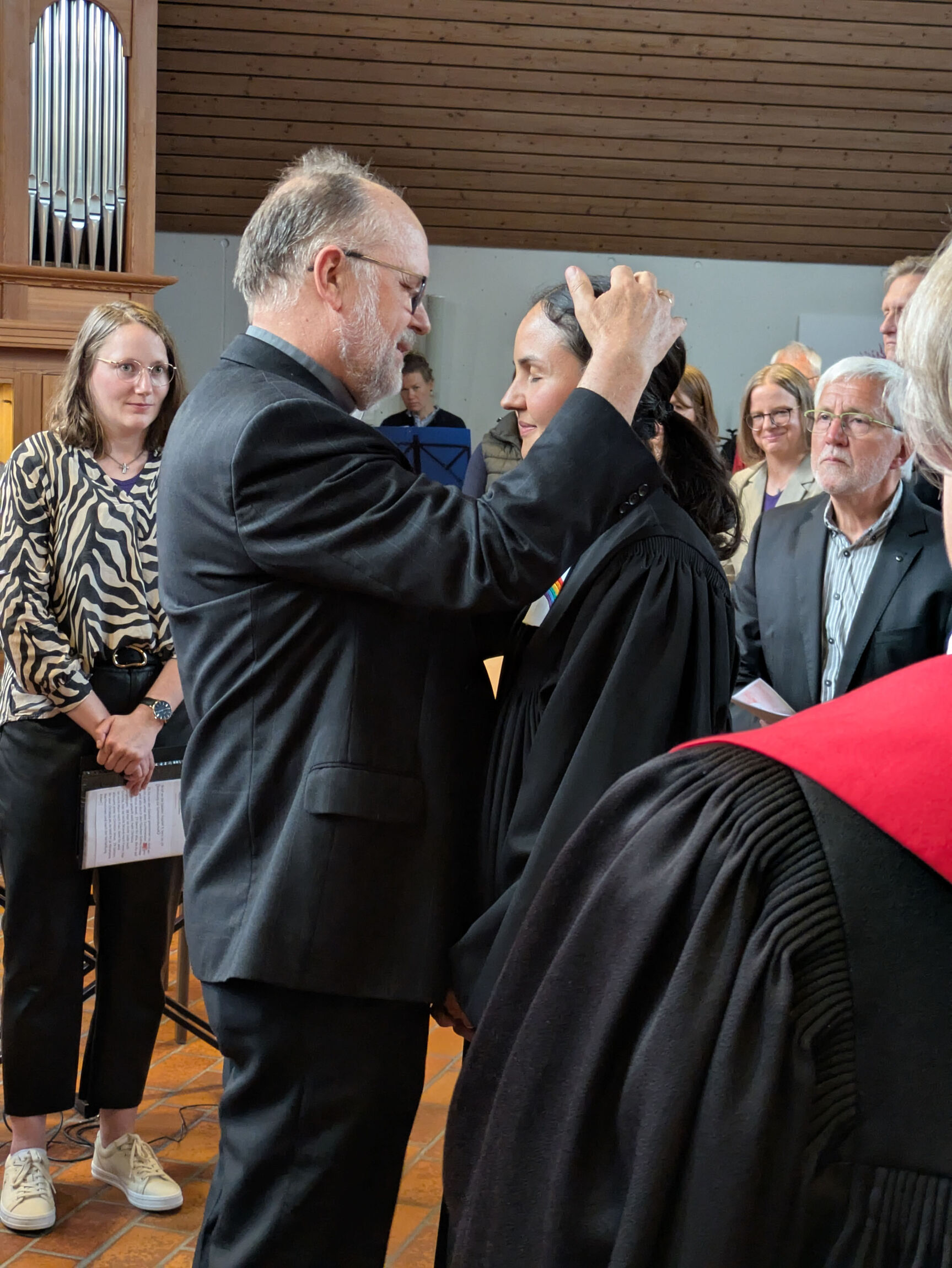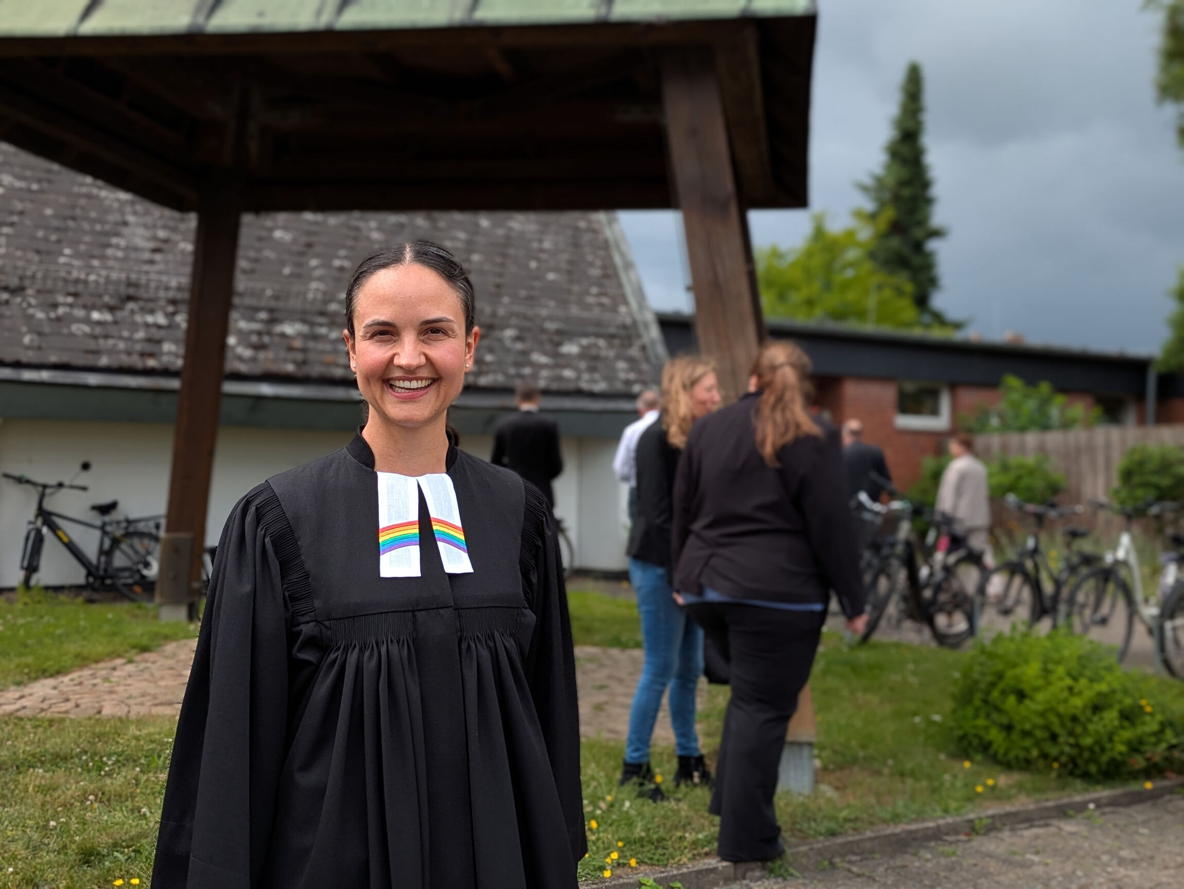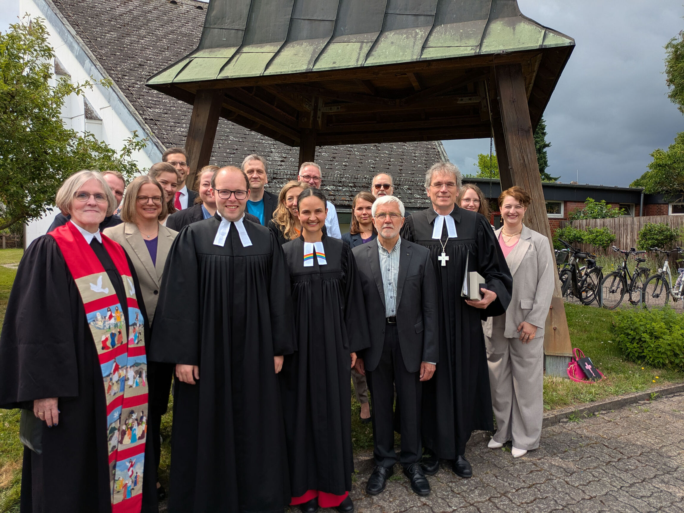 Regionalbischof Friedrich Selter aus Osnabrück hatte die Ordination durchgeführt, in Vertretung für Regionalbischöfin Dr. Petra Bahr, die erst kürzlich als Staatssekretärin nach Berlin wechselte. Außerdem wirkten Assistierende aus dem persönlichen Umfeld von Rebecca Schoppe mit, darunter ihr Vater sowie Kollege Sascha Maskow aus Harpstedt legten ihr segnend die Hände auf. Die Kirchenvorstände von Weetzen und Linderte hießen ihre neue Pastorin herzlich Willkommen und überreichten ein Team-T-Shirt in pfingstrot.