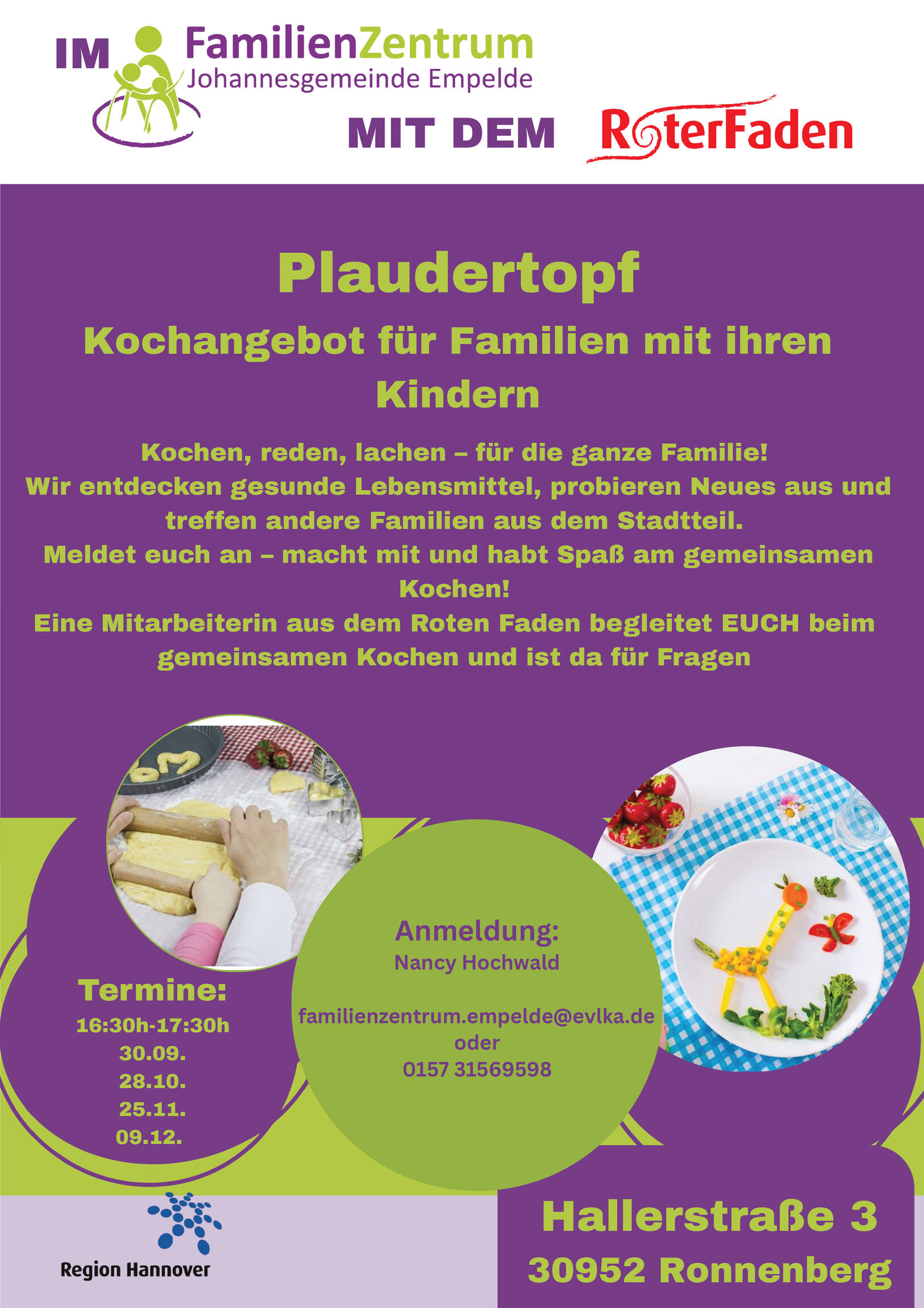 Nach dem Motto „Kochen, reden, lachen – für die ganze Familie!“ werden gemeinsam gesunde, regionale Lebensmittel entdeckt und neue Rezepte für den Familienalltag ausprobiert. Familien aus dem Stadtteil kommen miteinander in Kontakt. Eine Mitarbeiterin des Roten Fadens begleitet das Angebot im Familienzentrum in Empelde, steht für Fragen zur Verfügung und sorgt für eine entspannte Atmosphäre.
