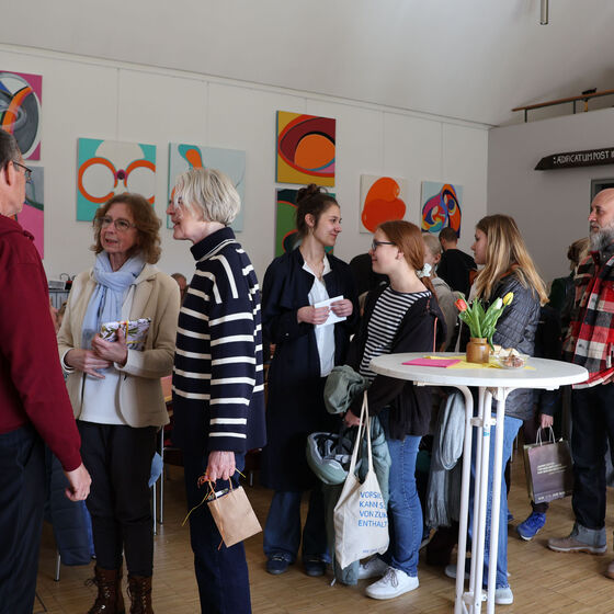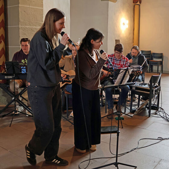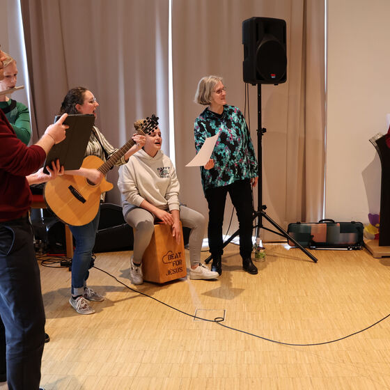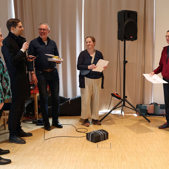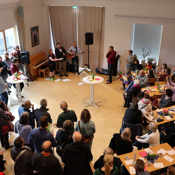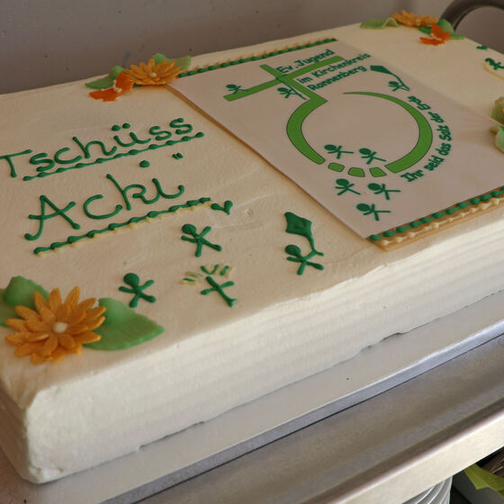 Es schloss sich ein Empfang im vollbesetzten Gemeindehaus an – mit vor allem musikalisch gestalteten Grußworten, launig und kurzweilig umgesetzt von Kolleginnen und Kollegen, Ehrenamtlichen aus den Gemeinden, Jugendlichen aus der Evangelischen Jugend und früheren Weggefährt*innen. Zum süßen Abschluss durfte Acki Stein eine XXL-Torte anschneiden und an die Gäste verteilen.