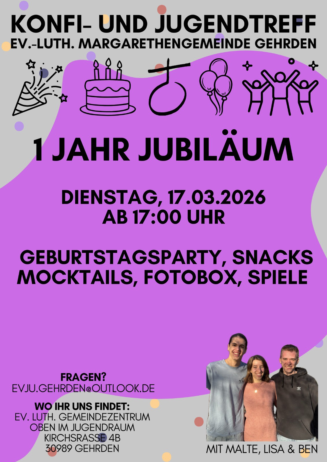 Am Dienstag, den 17. März 2026, ab 17:00 Uhr laden wir herzlich in den Jugendraum des Gemeindezentrums der Margarethengemeinde ein. Gemeinsam möchten wir auf ein Jahr voller Begegnungen, Spiele, Gespräche und Gemeinschaft zurückblicken und natürlich ordentlich feiern.