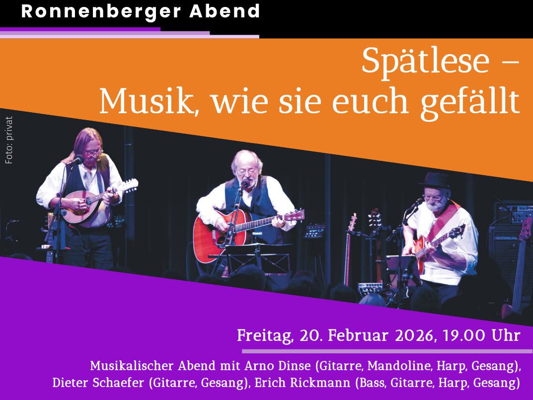 „Musik, wie sie euch gefällt“ beim „Ronnenberger Abend“ im Februar! Am Freitag, 20.02.2026, ab 19 Uhr führt die Gruppe Spätlese durch einen unterhaltsamen musikalischen Abend.