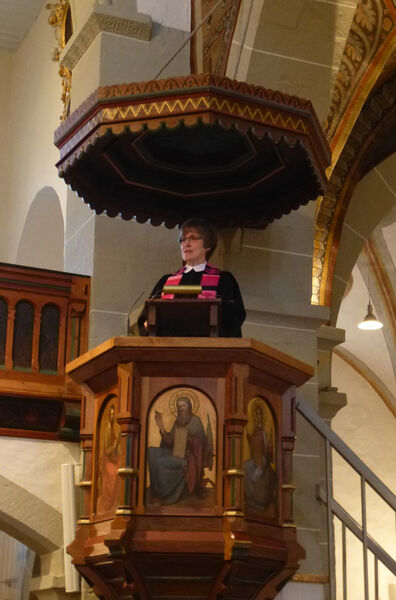 Landessuperintendentin Dr. Ingrid Spieckermann wendete sich in einer kurzen Ansprache an die Gemeinde. Für sie sei es bereits die dritte Visitation in Ronnenberg während ihrer Amtszeit. Sie wolle vor allem Dank sagen für die Treue und das große Engagement im Kirchenkreis und den Gemeinden. "Ich freue mich auf die Visitation, auf neue und erneute Begegnungen. Gemeinsam fragen wir, was uns trägt, was uns motiviert, wo wir über den Tellerrand des Vertrauten hinaus schauen", meinte sie und bot ausdrücklich auch persönliche Gespräche an. Erste Begegnungen waren dann bereits beim abschließenden Kirchenkaffee in der Kirche möglich.