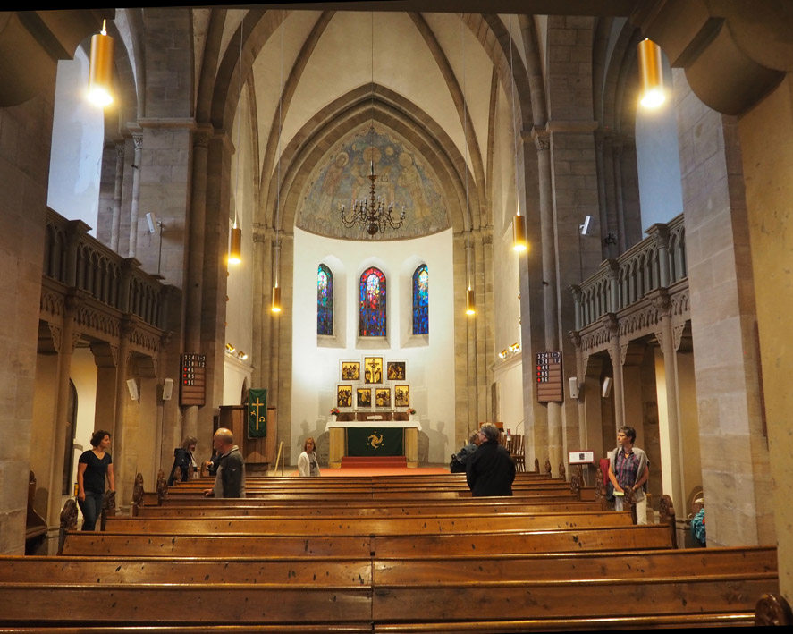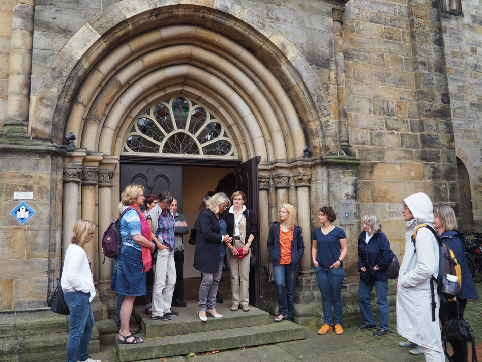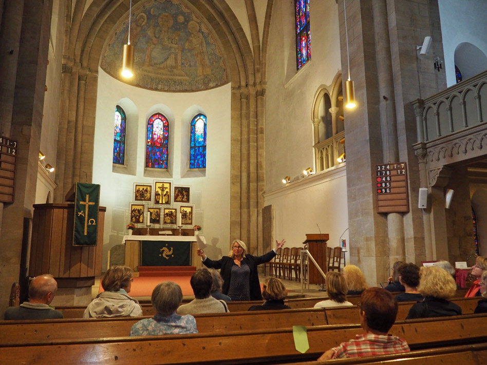 Die Reihe der jährlichen kirchenpädagogischen Nachmittage, die Pastorin Elke Pankratz-Lehnhoff organisiert, machte am 31. August Station in der Klosterkirche Barsinghausen. Referentin des Nachmittags war Dr. Birgit Sendler-Koschel, die Leiterin der Bildungsabteilung der Evangelischen Kirche in Deutschland (EKD). Sie ging in einer ersten Gesprächsrunde der rund 15 Teilnehmerinnen und Teilnehmer im Gemeindehaus zunächst auf die Zahlensymbolik in einer Kirche ein und welche Bedeutung dahintersteht. Später erkundete die Gruppe mit unterschiedlichen Methoden die Kirche: Einzeln gingen die Gäste in die Kirche und suchten sich dort schweigend zunächst einen Platz, an dem sie gern verweilen würden - diese Plätze markierten sie mit Pfeilen aus Papier. Birgit Sendler-Koschel berichtete aus der über 800 Jahren alten Kirchenbaugeschichte und ging dort ebenfalls auf die Symbolik im Kirchenschiff ein. In der Taufkapelle versammelten sich schließlich alle. Dort wurde der bekannte 23. Psalm vom Guten Hirten gelesen - ein Psalm, der wohl ursprünglich ein Danklied eines Menschen war, der im Tempel Asyl fand. Einzelne Verse des Psalms murmelnd gingen die Teilnehmenden durch die Kirche, suchten sich dann mit anderen zusammen Orte in der Kirche, zu denen einzelne Verse passten und gestalteten dort Bodenbilder mit Tüchern und Kerzen.