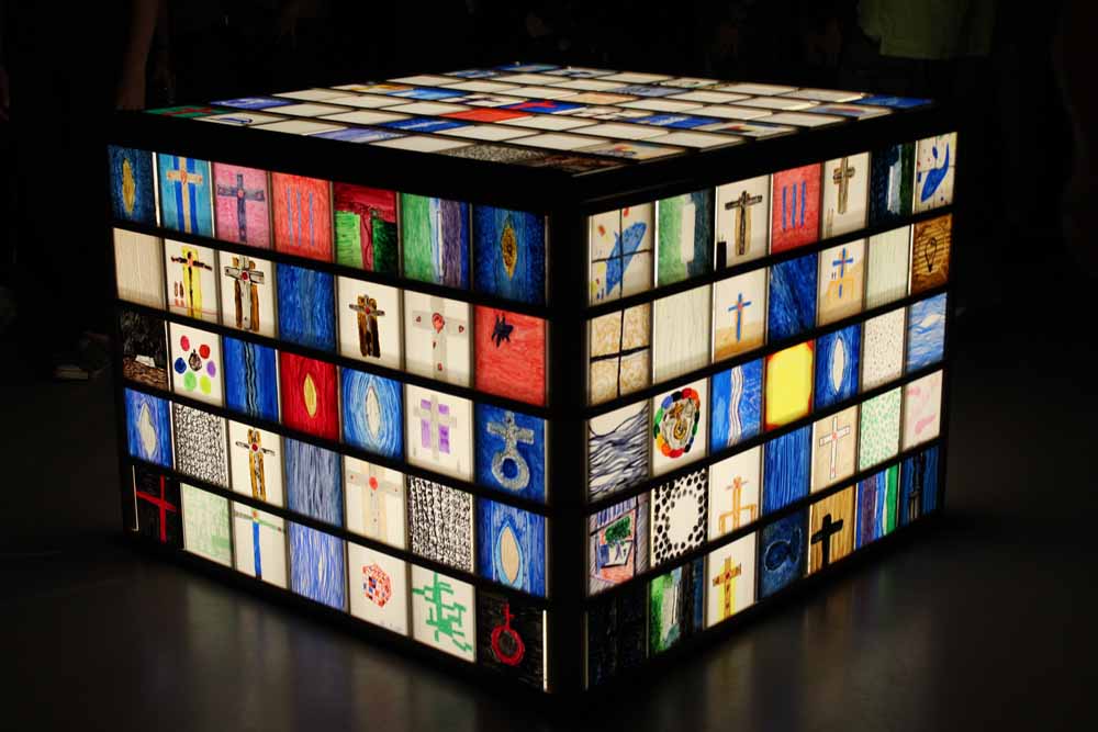 Ein im letzten Jahr von Jugendlichen nachgebautes Modell des Christuspavillons wurde anschließend von den Konfirmanden mit kleinen Kunstwerken geschmückt. Jeder konnte eigene Eindrücke aus Kirche und Kloster auf Plexiglas malen. Die kleinen Kunstwerke wurden später mit dem Modell verbunden. Bei der abendlichen gemeinsamen Abendmahls-feier wurde mit Beginn der Dunkelheit die Innenbeleuchtung angeschaltet.