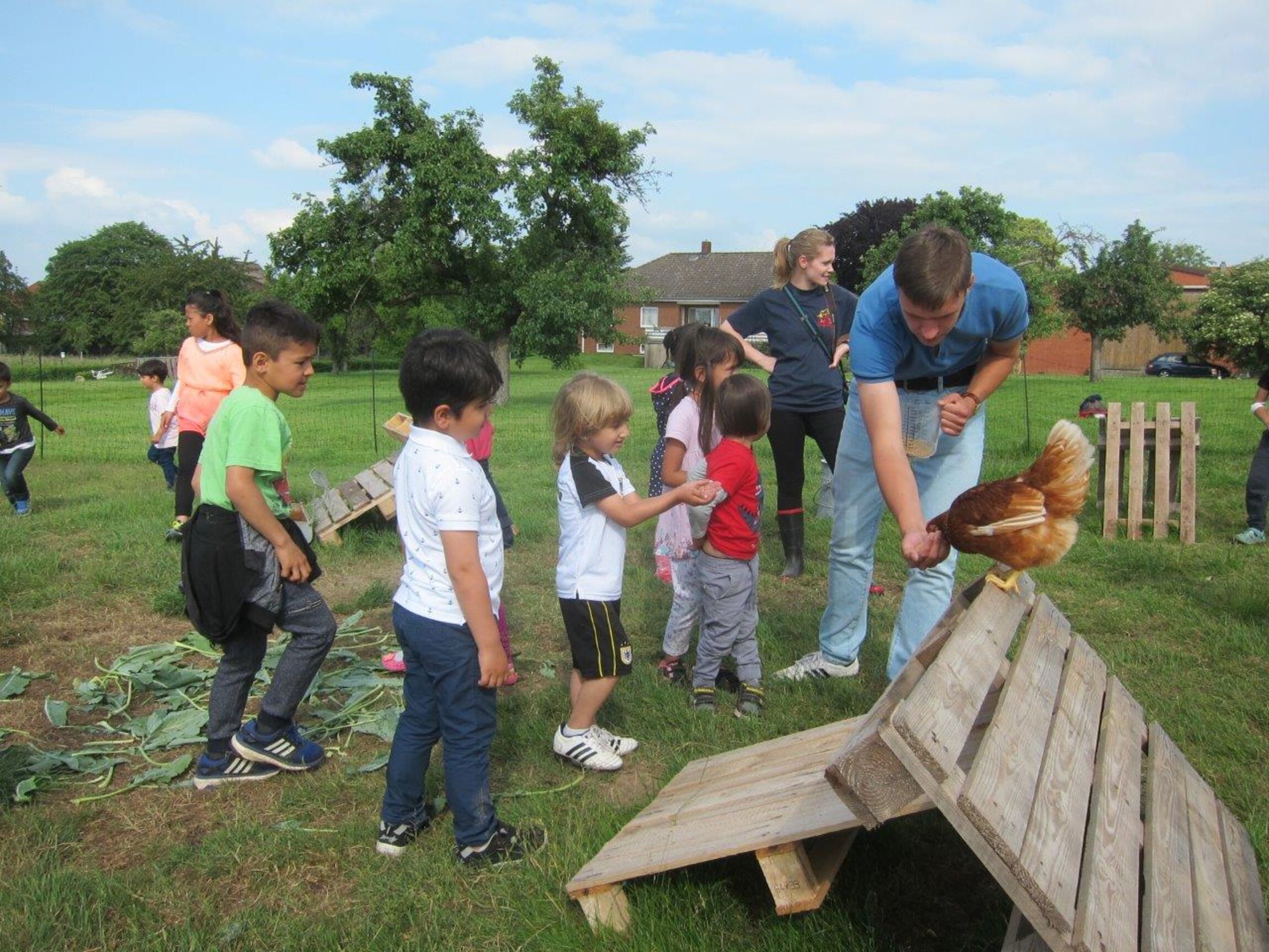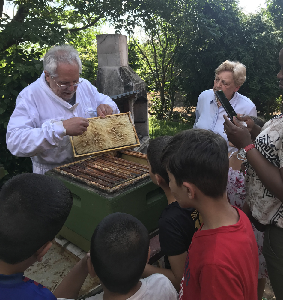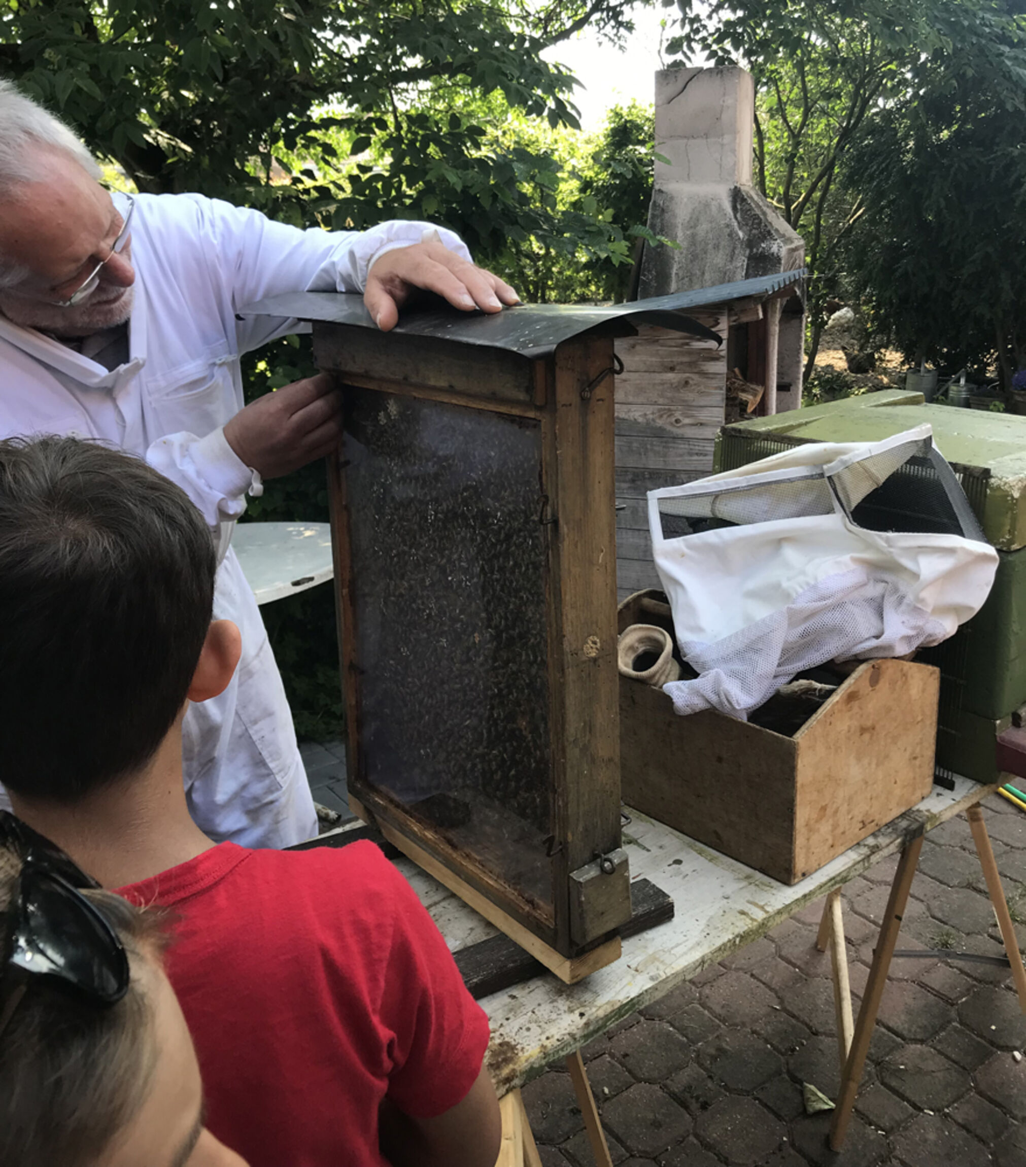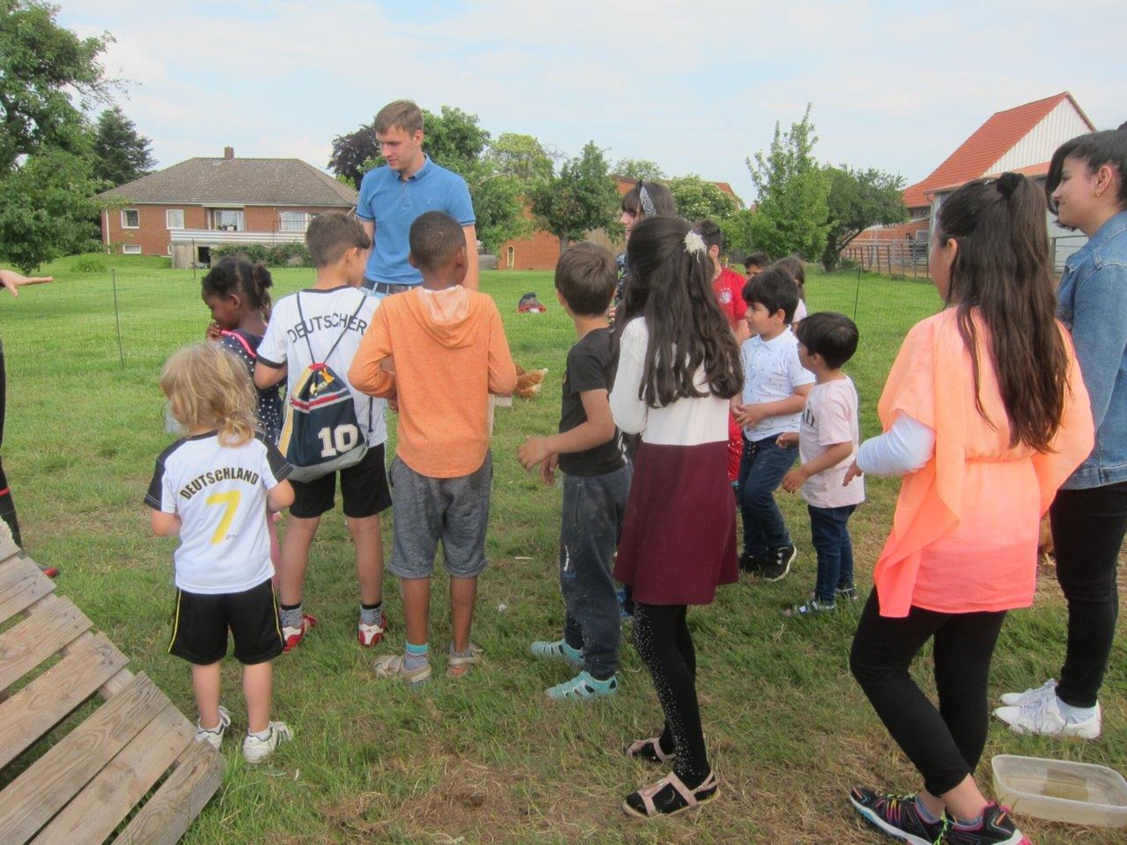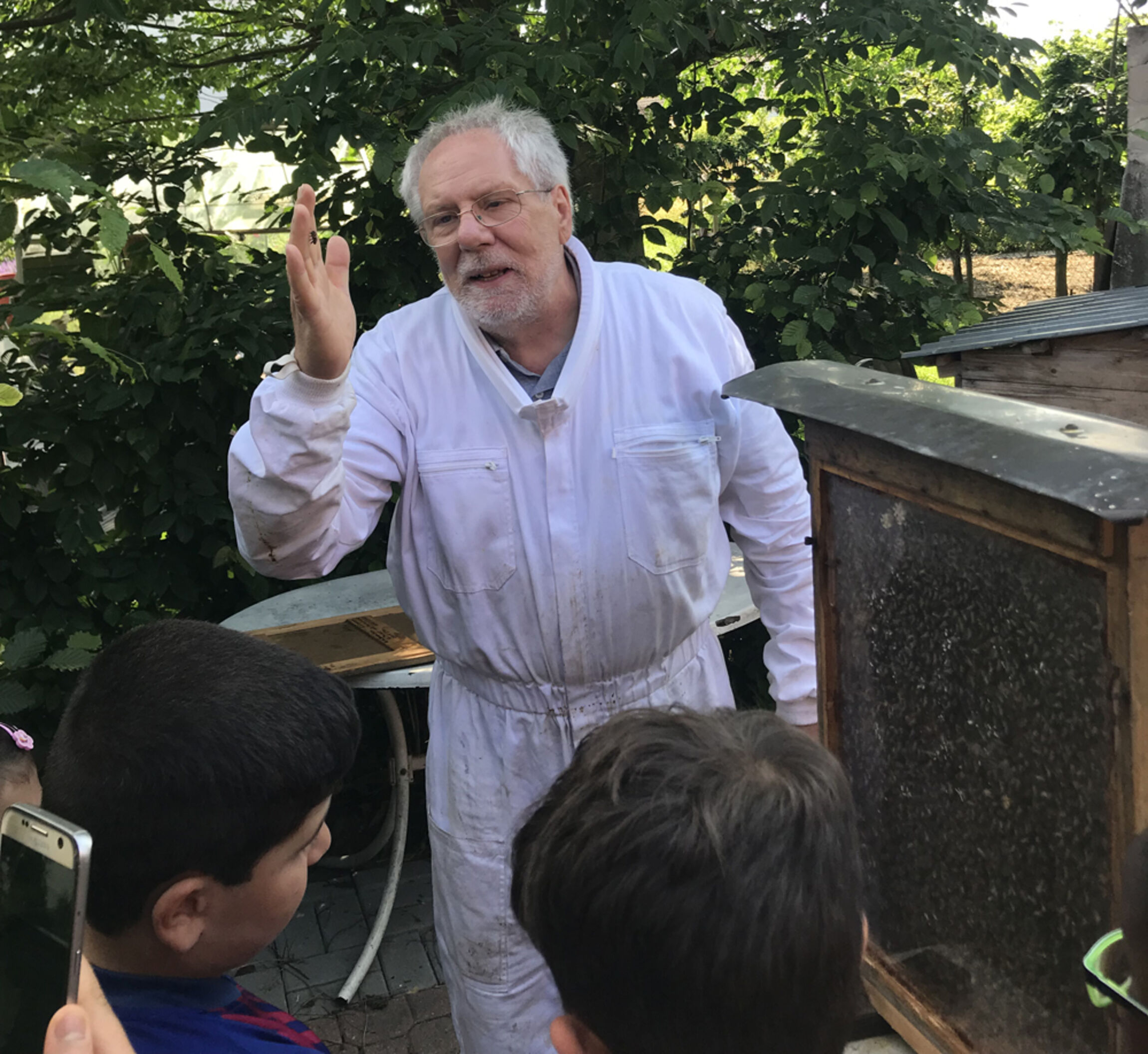 Nach anfänglicher Scheu schaffte es der Imker sehr schnell, den Kindern die Angst zu nehmen und erklärte ihnen das richtige Verhalten in Bezug auf die Bienen: Die Ruhe bewahren und nicht um sich schlagen.