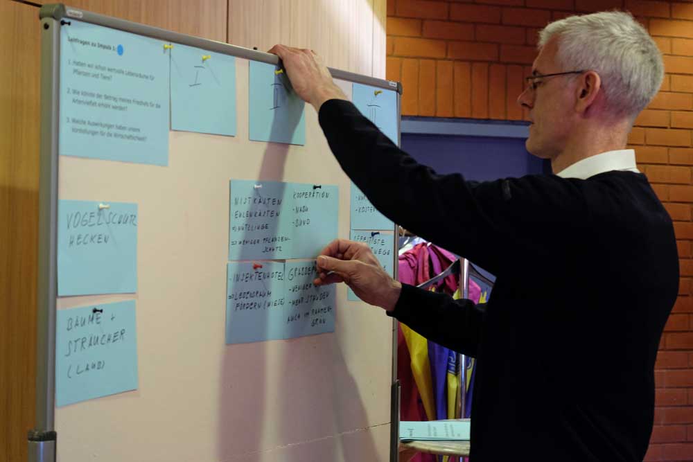 Martin Lahmsen, Landeskirchenamt, führte durch die Tagung. Mit drei Impulsvorträgen und anschließenden Arbeitsgruppen wurden von den Teilnehmenden Herausforderungen benannt und konkrete Lösungswege diskutiert, wie kirchliche Friedhöfe zukunftsfähig gestaltet werden können. Der erste Impulsvortrag von Ulrike Wolf, Haus kirchlicher Dienste, befasste sich mit der Frage der Nachhaltigkeit und wie Biodiversität auf kirchlichen Friedhöfen erreichen kann. Dabei spielen Art und Auswahl von Bäumen wie auch die Blumenauswahl auf den Gräbern eine entscheidende Rolle. Die Eiche gibt zum Beispiel über 700 Insektenarten eine Heimat, die Esche nur einem Drittel davon. Eine Blumenwiese auf dem Friedhof, Insektenhotels und Nistkästen fördern die Biodiversität.