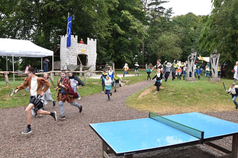 Neben dem Bergfest war das Programm bunt und vielfältig. So wurden in Workshops für die Kinder Verkleidungen gebastelt und das Bogenschießen trainiert, Löffel geschnitzt, Anhänger aus Geweih hergestellt, Körbe und Freundschaftsbänder geflochten. Die Kinder überlegten sich ein eigenes Banner und Wappen für ihre Zeltgruppen.