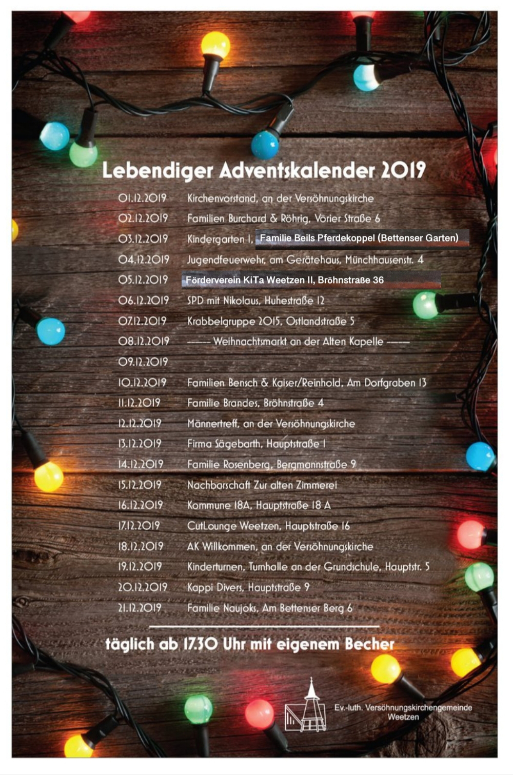 Das komplette Programm mit allen Stationen wird auf Plakaten bekanntgegeben, außerdem auf der Homepage der Weetzener Kirchengemeinde.