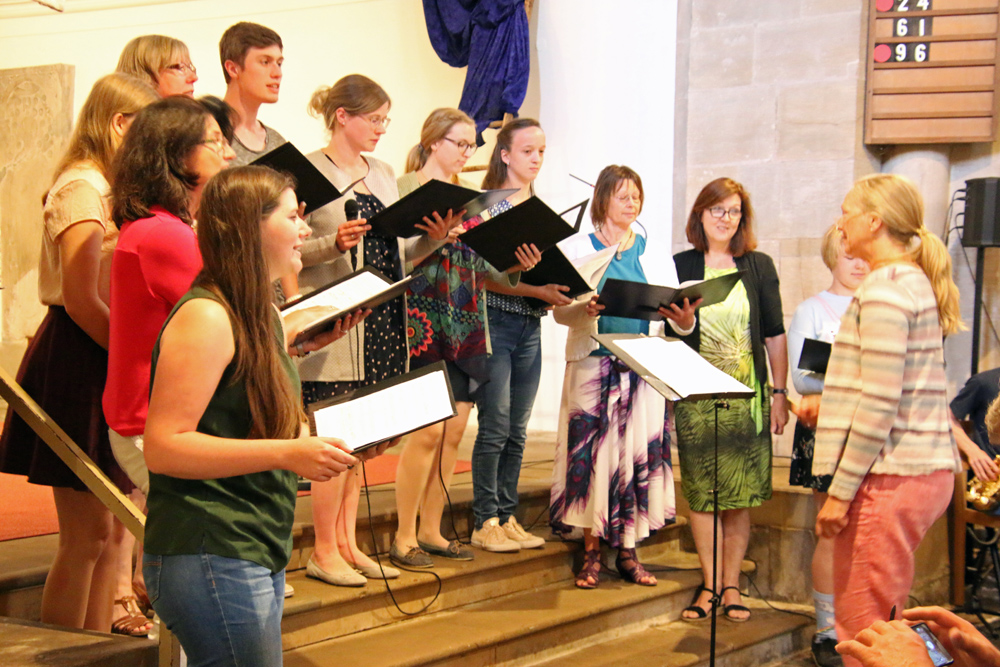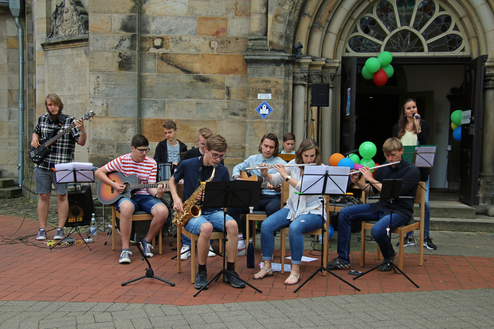 Zuvor feierte die Mariengemeinde einen fröhlichen Projektgottesdienst aus der Reihe „lebendig, erfrischend, bewegend“. Das Team griff das Thema „Halte deine Träume fest“ und erinnerte ausgehend von der weltberühmten Rede Martin Luther Kings über seinen Traum einer Menschheit ohne Rassentrennung und Diskriminierung an eigene Träume, aber auch an die Träume Jakobs aus der Bibel. „Jakob hatte sich als Zweigeborener den Segen seines Vaters erschlichen. Doch für welchen Preis? Der Zukurzgekommene zahlte einen hohen Preis für den Segen. Er verlor die Heimat, musste als Flüchtling um sein Leben fürchten und liegt nun müde auf einem Stein. Und er träumt von Engeln, die auf einer Himmelsleiter auf und ab steigen. Gott spricht zu ihm im Traum. Er will ihn schützen. Was für ein Traum!“, sagte Uta Junginger in ihrer kurzen Ansprache. An vier Stationen konnten die Gäste im Gottesdienst das Thema vertiefen. Sie bastelten kleine Leitern oder schrieben ihre eigenen Träume auf. Besondere Wünsche schrieben sie für Theo Gnaß auf, der im Gottesdienst getauft wurde. Seine Mutter ist Mitglied im Jungen Ensemble, das unter der Leitung von Martin Blume in der Kirche sang. Die Jugendband der Mariengemeinde „Die Band(e)“ unterhielt die Gäste nach dem Gottesdienst noch mit einem kleinen Open-Air-Konzert. Verstärkt wird die Band, die von Gerald Pursche geleitet wird, neuerdings von der Sängerin Corinna Moldenhauer.