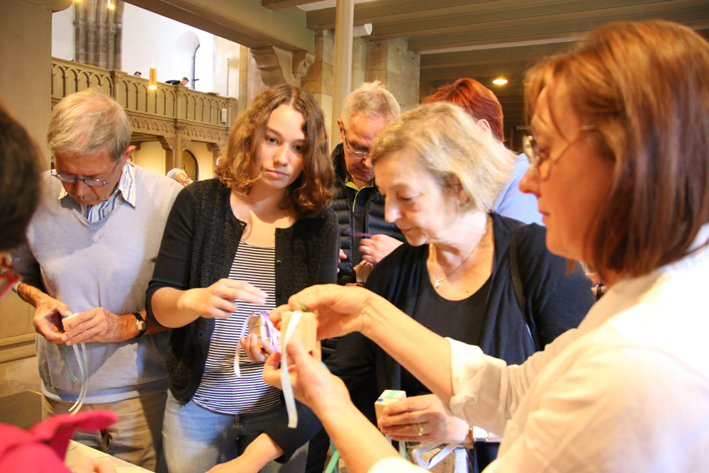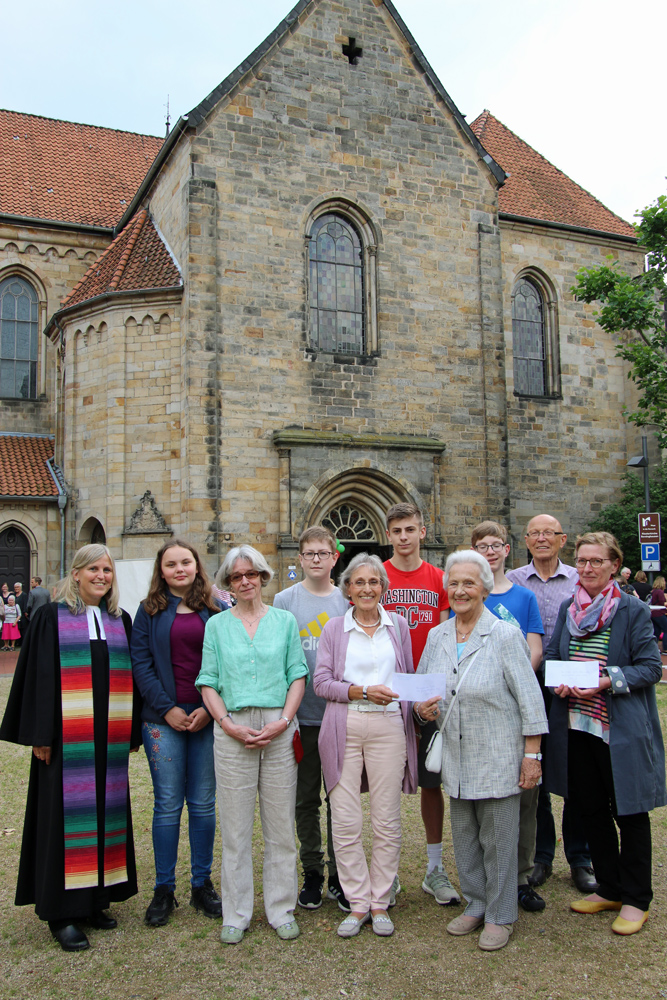 In den Konfirmationsgottesdiensten wird auch eine Spende der gerade Konfirmierten eingesammelt. Drei Spendenzwecke hatten die Jugendlichen in der Mariengemeinde in diesem Jahr festgelegt: Für die Tafel der Arbeiterwohlfahrt, für die IG Eltern geistig Behinderter und für das Schülerhilfeprojekt im Senegal, das der Eine-Welt-Laden begleitet. Die Konfirmierten lernten alle drei Projekte während der Unterrichtszeit kennen, unter anderem sammelten sie auch „Ein Teil mehr“ für die Tafel in der Adventszeit. 1005 Euro kamen als Spende in diesem Jahr zusammen. „Die Jugendlichen konnten sich jeweils für einen Zweck entscheiden. Sie gaben 130 Euro für die Tafel, 240 Euro für die IG Eltern und 635 Euro für die Schülerhilfe Senegal“, erklärte Pastorin Uta Junginger im Anschluss an den Projektgottesdienst in der Klosterkirche am Sonntagnachmittag, 16. Juni. Stellvertretend überreichten vier Konfirmierte die Spenden an Aktive der drei Projekte. Das Geld für die Schülerhilfe Senegal wird später direkt an Ute Gierczynski-Bocandé überreicht, die vor Ort die Schulen kennt und begleitet.