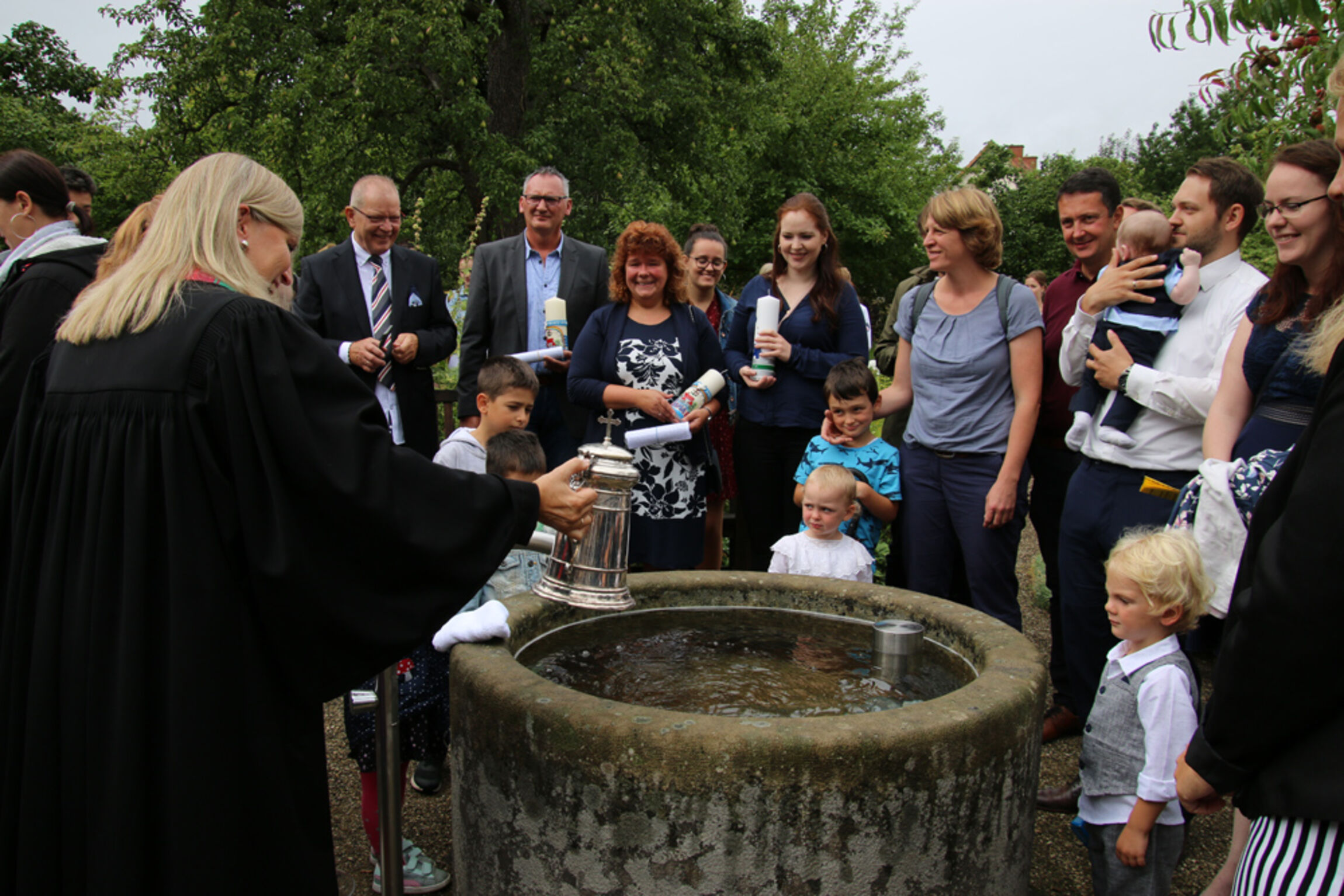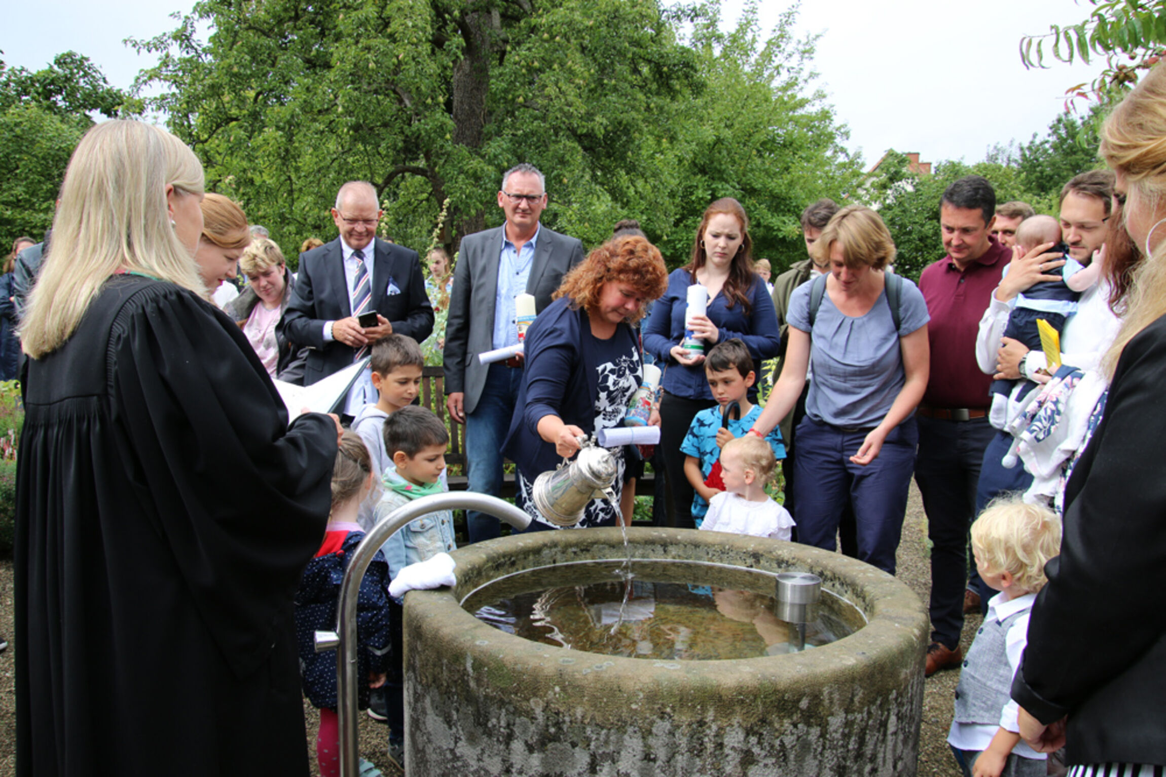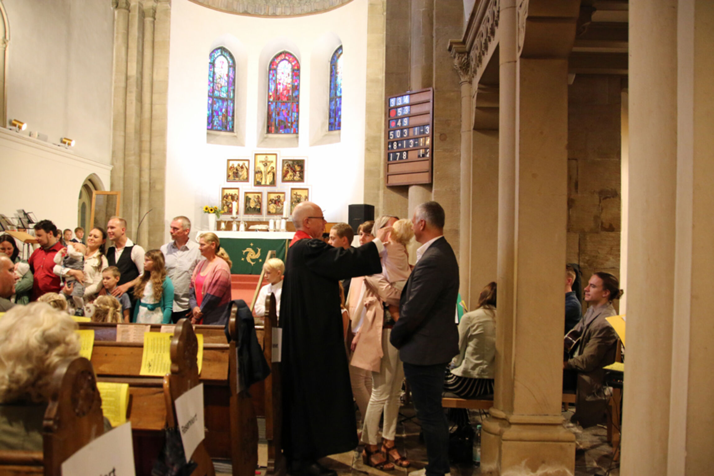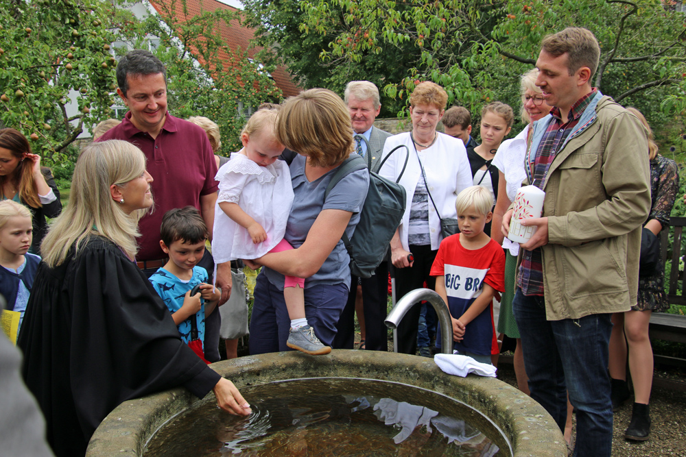 Der jüngste Täufling war erst sieben Wochen alt und wurde von seinen Eltern schon ungeboren zum Tauffest angemeldet, der älteste Täufling ist 50 Jahre alt und trat zusammen mit seiner Ehefrau an den Brunnen mit Klostergarten, um dort von Pastorin Uta Junginger getauft zu werden. Insgesamt 14 Babys, Kinder verschiedenen Alters, eine Konfirmandin und Erwachsene wurden am Sonntag, 18. August, beim Tauffest der Mariengemeinde in der Klosterkirche und im Klostergarten von Pastor Jürgen Holly, seiner Kollegin Uta Junginger und Vikarin Mira Neckel getauft. "Manche haben sogar extra mit der Taufe gewartet, bis wieder ein Tauffest angeboten wurde. Wir freuen uns sehr und setzen ein positives Zeichen", freute sich Uta Junginger im Gottesdienst. Die Idee eines gemeinsamen Festes, auch mit anschließender Feier, kommt sehr gut an. Und so erlebten die vielen Gäste in der Kirche beim gemeinsamen Auftakt, bei den Taufen selbst und dem späteren Essen im Klosterinnenhof eine harmonische Feier. Alle Täuflinge versammelten sich im Gottesdienst im Halbkreis vor dem Altarraum und wurden dort bereits mit dem Zeichen des Kreuzes gesegnet. Pastor Jürgen Holly erzählte die Geschichte von Jesus und den Kindern, die dieser besonders in den Mittelpunkt stellte. Und Mira Neckel löcherte als Puppe Maxi Pastorin Uta Junginger mit ihren Fragen zur Bedeutung der Taufe. "Durch die Taufe gehörst du richtig dazu zur Kirche und zu Gott. Man ist nie zu alt zur Taufe. Und Gott passt auf uns auf, auch wenn wir mal Angst haben. So ging es zum Beispiel Martin Luther. Wenn er sich besonders fürchtete, schrieb er 'ich bin getauft' auf einen Spiegel", sagte Uta Junginger. Als Erinnerung an diese Begebenheit erhielten alle Täuflinge einen Lutherfigur von Playmobil.