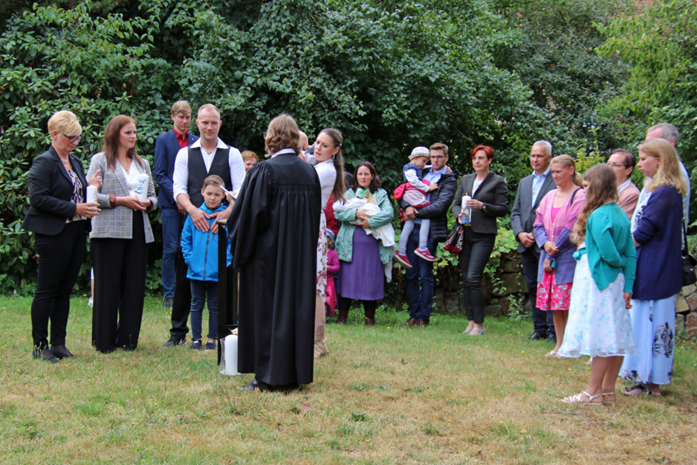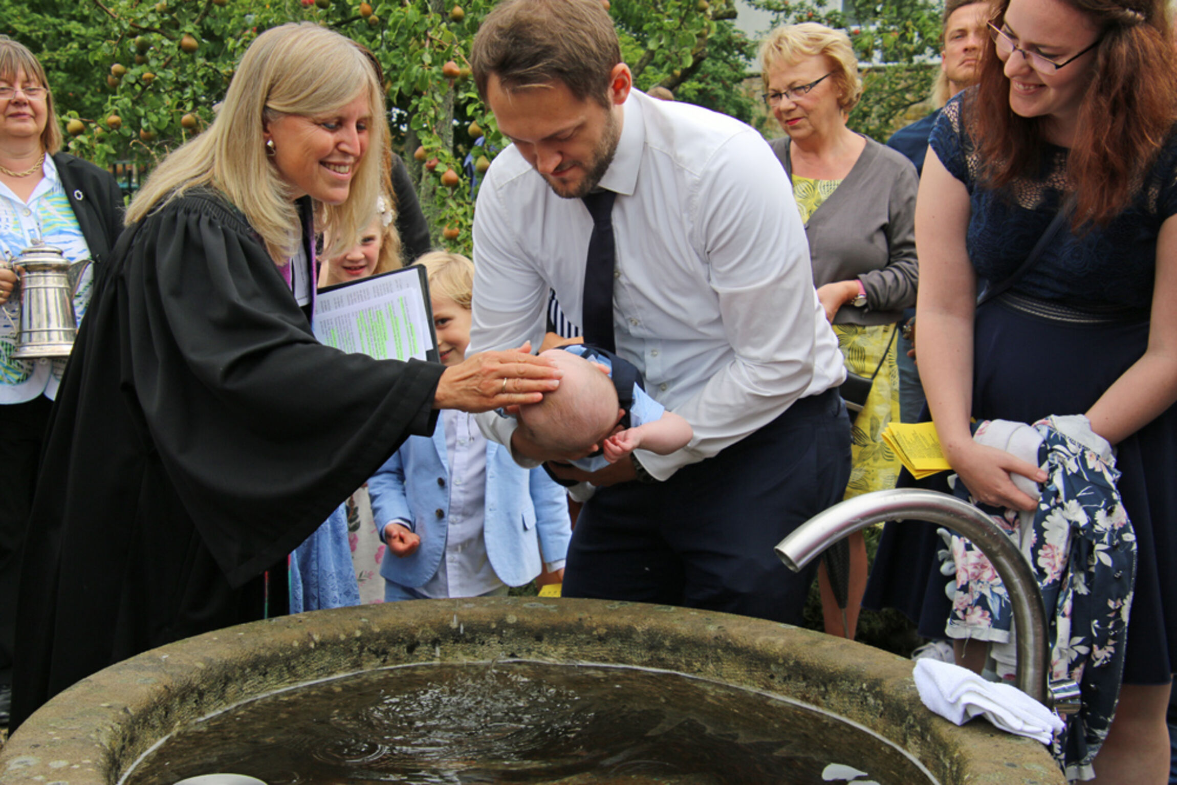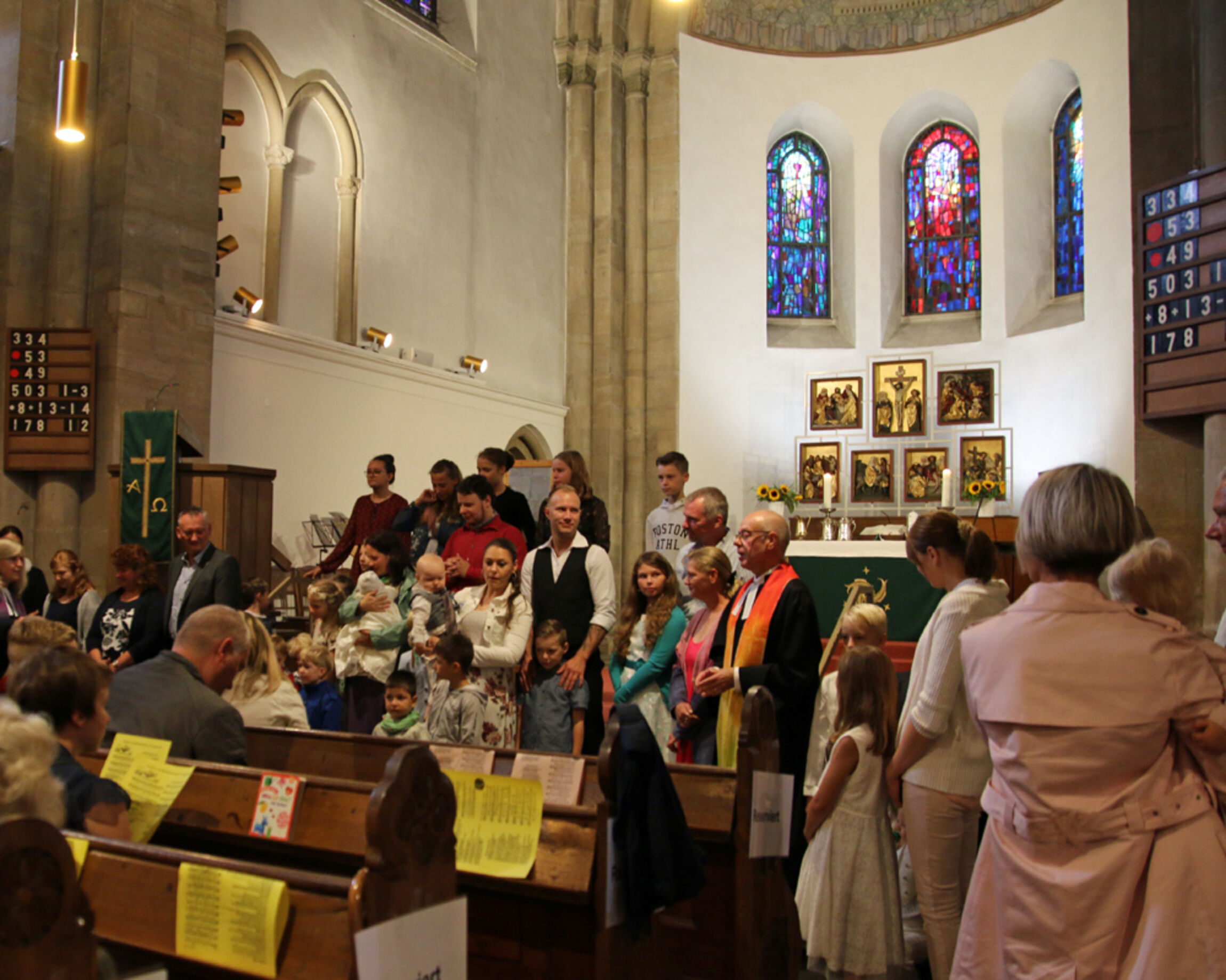Der jüngste Täufling war erst sieben Wochen alt und wurde von seinen Eltern schon ungeboren zum Tauffest angemeldet, der älteste Täufling ist 50 Jahre alt und trat zusammen mit seiner Ehefrau an den Brunnen mit Klostergarten, um dort von Pastorin Uta Junginger getauft zu werden. Insgesamt 14 Babys, Kinder verschiedenen Alters, eine Konfirmandin und Erwachsene wurden am Sonntag, 18. August, beim Tauffest der Mariengemeinde in der Klosterkirche und im Klostergarten von Pastor Jürgen Holly, seiner Kollegin Uta Junginger und Vikarin Mira Neckel getauft. "Manche haben sogar extra mit der Taufe gewartet, bis wieder ein Tauffest angeboten wurde. Wir freuen uns sehr und setzen ein positives Zeichen", freute sich Uta Junginger im Gottesdienst. Die Idee eines gemeinsamen Festes, auch mit anschließender Feier, kommt sehr gut an. Und so erlebten die vielen Gäste in der Kirche beim gemeinsamen Auftakt, bei den Taufen selbst und dem späteren Essen im Klosterinnenhof eine harmonische Feier. Alle Täuflinge versammelten sich im Gottesdienst im Halbkreis vor dem Altarraum und wurden dort bereits mit dem Zeichen des Kreuzes gesegnet. Pastor Jürgen Holly erzählte die Geschichte von Jesus und den Kindern, die dieser besonders in den Mittelpunkt stellte. Und Mira Neckel löcherte als Puppe Maxi Pastorin Uta Junginger mit ihren Fragen zur Bedeutung der Taufe. "Durch die Taufe gehörst du richtig dazu zur Kirche und zu Gott. Man ist nie zu alt zur Taufe. Und Gott passt auf uns auf, auch wenn wir mal Angst haben. So ging es zum Beispiel Martin Luther. Wenn er sich besonders fürchtete, schrieb er 'ich bin getauft' auf einen Spiegel", sagte Uta Junginger. Als Erinnerung an diese Begebenheit erhielten alle Täuflinge einen Lutherfigur von Playmobil.