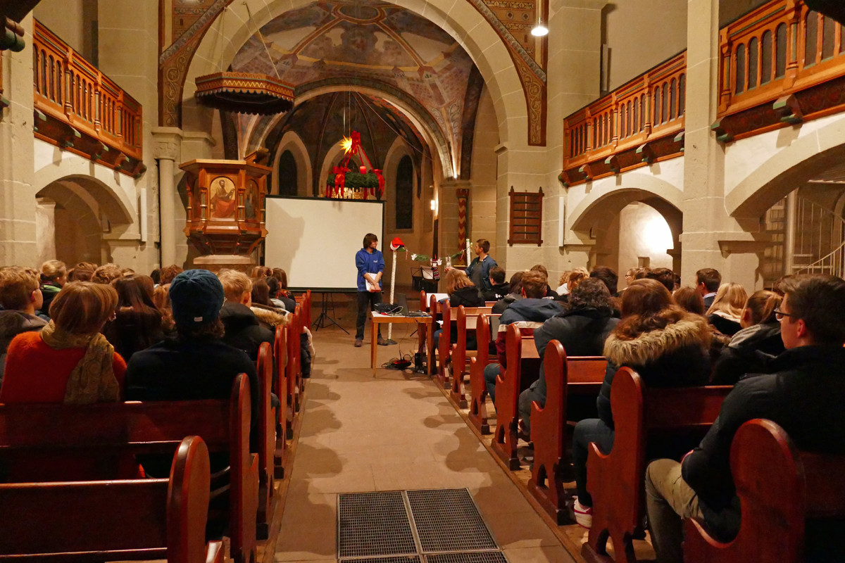 Der Weihnachtsstammtisch in das jährliche Dankeschön an die vielen Teamerinnen und Teamer in der evangelischen Jugend im Kirchenkreis Ronnenberg. Am Freitag, 13. Dezember, blickten rund 80 Gäste in der Michaeliskirche und bei der anschließenden Feier im Gemeindehaus auf ein abwechslungsreiches Jahr zurück. "Mein Adventskalender erinnert an die unfassbar vielen Aktionen im Jahr, an Jugendgottesdienste, an das Filmprojekt in Barsinghausen, den Kirchentag, die Kinderfreizeit in Uslar, Jugendfreizeiten, den Erste-Hilfe-Kurs und vieles mehr", erzählte Kolja Wagner im Gespräch mit Jan-Lennart Boje, dem Diakon im Anerkennungsjahr im Kirchenkreisjugenddienst. Ein Adventskalender helfe, diese Zeit bis Heiligabend bewusster wahrzunehmen, meinte Jan-Lennart Boje in seiner Ansprache. Das hauptamtliche Team lasse sich immer wieder überraschen von der großen Energie, mit der die Jugendlichen die vielen Aktionen umsetzen. "Euer Engagement ist uns sehr bewusst", sagte er. Dem Dank schlossen sich auch Kirchenkreisjugendwart Helge Bechtloff und Superintendentin Antje Marklein im Gemeindesaal an. "Der Weihnachtsstammtisch ist für uns ein Ort, danke zu sagen für die vielen Aktivitäten in den Kirchengemeinden, Regionen und im Kirchenkreis. Schön, dass wir dies heute feiern können", sagte die Superintendentin, die zum Start des gemeinsamen Essens ein Tischgebet sprach. Später folgte noch ein interaktives Quiz rund um Weihnachten. Außerdem erhielt jede Teilnehmerin und jeder Teilnehmer ein kleines Geschenk.