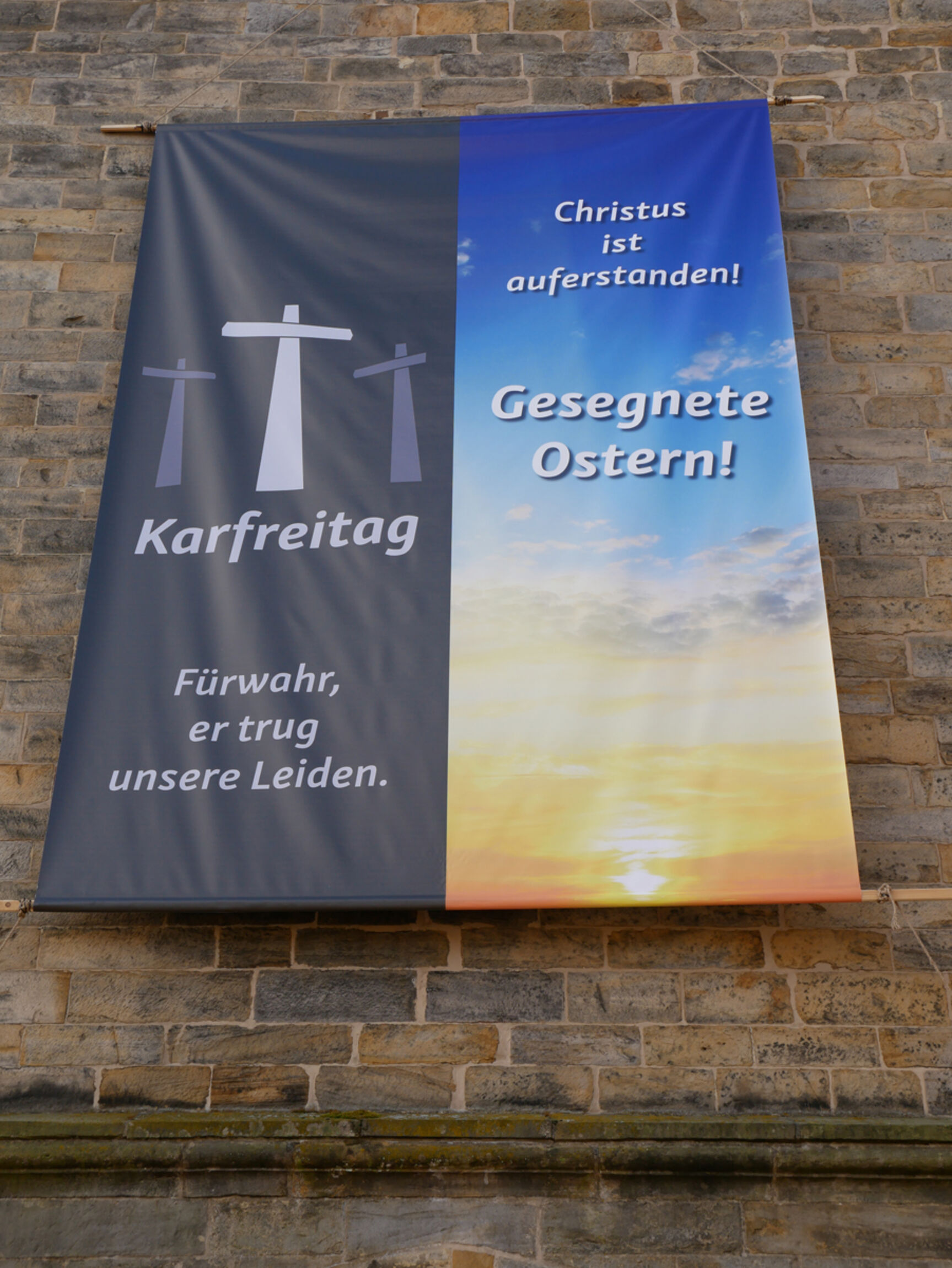 Jürgen Holly, der Initiator, erklärt dazu: "Zunächst erinnert das Banner mit den Karfreitagskreuzen und dem Osterspruch 'Christus ist auferstanden' an die christliche Botschaft. Es kann aber auch alle Menschen ansprechen. Auf der linken Seite befindet sich die Dunkelheit, die das vielfältige Leiden der Menschen in diesen unruhigen Zeiten der Coronapandemie symbolisiert. Demgegenüber geht eine strahlende Sonne auf. Es gibt viel Dunkelheit, aber am Ende siegt das Licht".