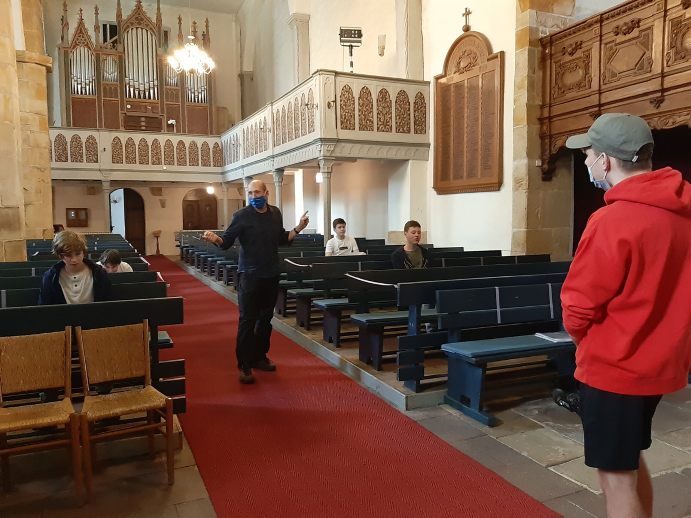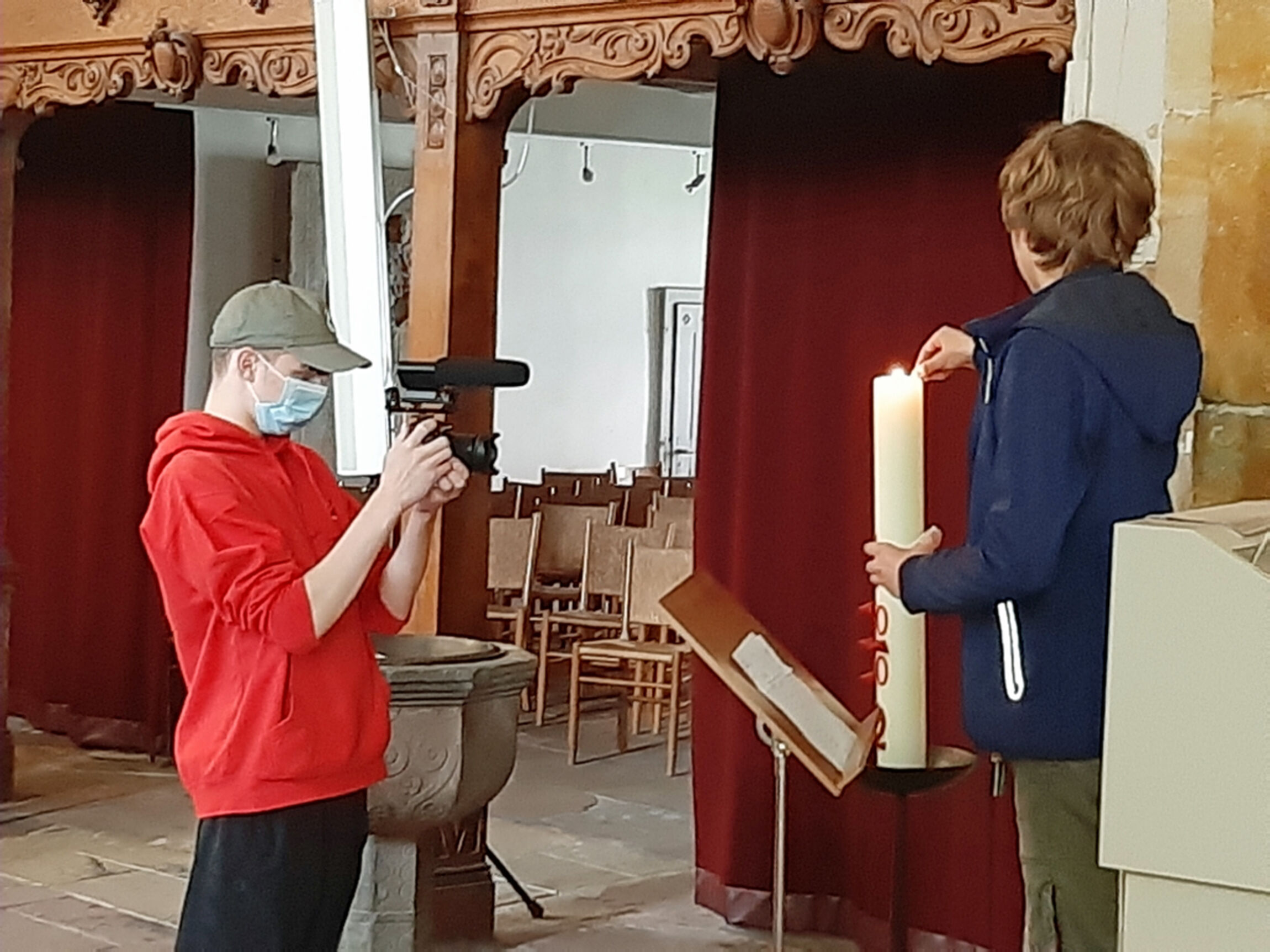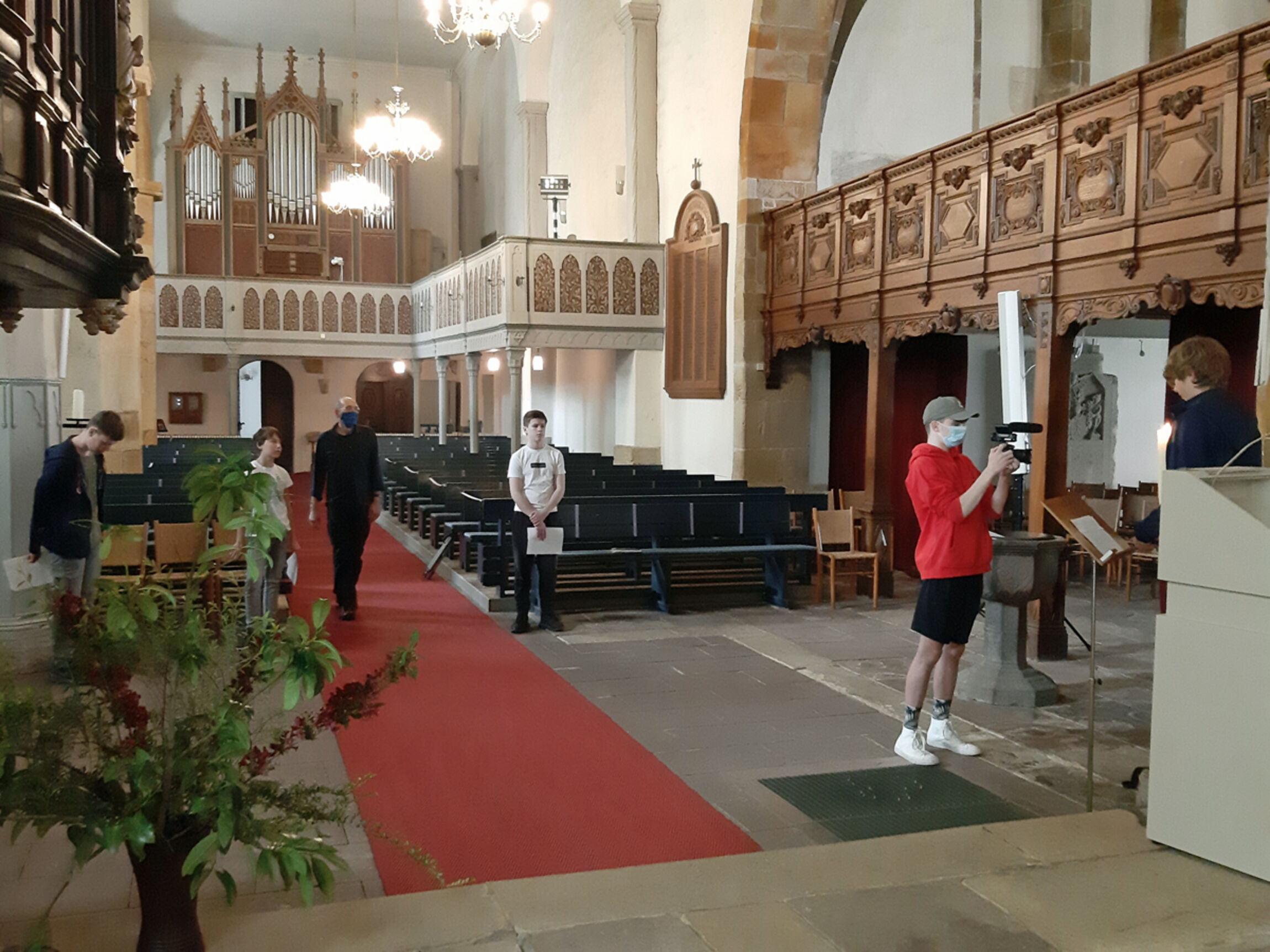 Im März wollten die Konfirmandinnen und Konfirmanden aus Wennigsen von ihrem Diakonieprojekt im Gottesdienst erzählen. "Dieser Gottesdienst Mitte März war eine der ersten Veranstaltungen, die aufgrund der Corona-Pandemie abgesagt wurden", erinnert sich Diakon Martin Wulf-Wagner. Und auch die geplanten Konfirmationen mussten auf einen späteren Termin im Spätsommer verschoben werden. Nun entstand eine Idee, die in den nächsten Tagen nach und nach umgesetzt wird. In Kleinstgruppen, nach einem ausgetüftelten Zeitplan, kommen die Jugendlichen in die Klosterkirche. Dort werden die einzelnen Abschnitte des Gottesdienstes von Lasse Fahrenbach nach vorheriger Absprache mit Diakon Martin Wulf-Wagner und kurzer Probe gefilmt. Im Eingangsbereich der Kirche achten andere Teamerinnen und Teamer der Evangelischen Jugend darauf, dass jeweils nur die Kleinstgruppe die Kirche getritt. "Wir schneiden nach den drei Aufnahmetagen den Film und dann bekommen die Konfirmanden und Konfirmandinnen das Ergebnis als Erinnerung auf einen Stick. Ob das im September im Zusammenhang mit der Konfirmationsfeier oder zeitnah geschieht entscheiden wir später", erklärt Martin Wulf-Wagner.
