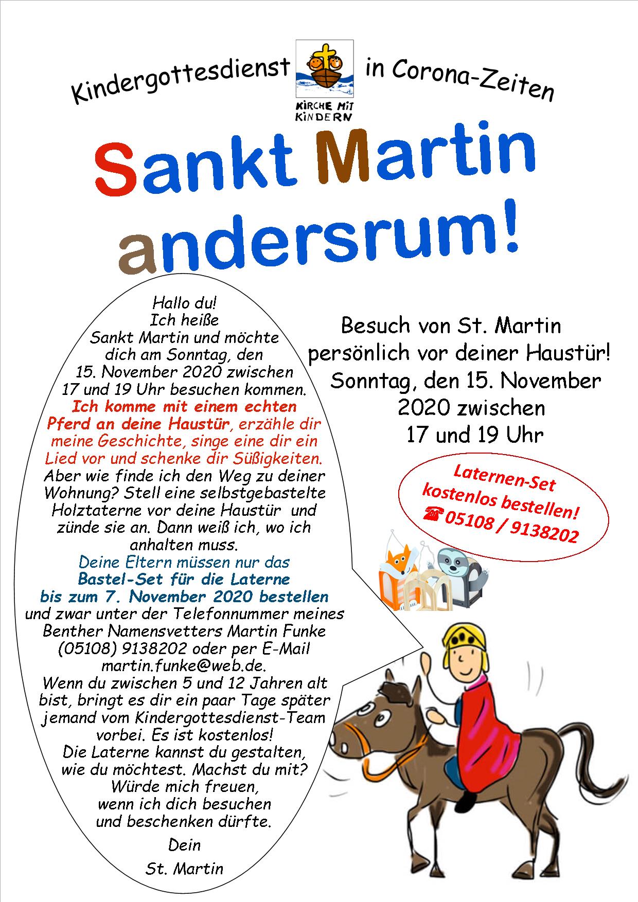 Wer möchte Besuch von Sankt Martin? Am Sonntag, den 15. November 2020 zwischen 17und 19 Uhr kommt der bekannte römische Heilige zu Benther Kindern an die Tür und präsentiert Süßes für Ohr und Gaumen. Verkleidete Mtarbeitende des Kindergottesdienst-Teams Benthe und Pastor Martin Funke spielen die Geschichte von Sankt Martin jedem angemeldeten Kind vor der Tür vor. Anschließend singen sie ihm noch ein Lied vor und schenken ihnen Süßigkeiten.