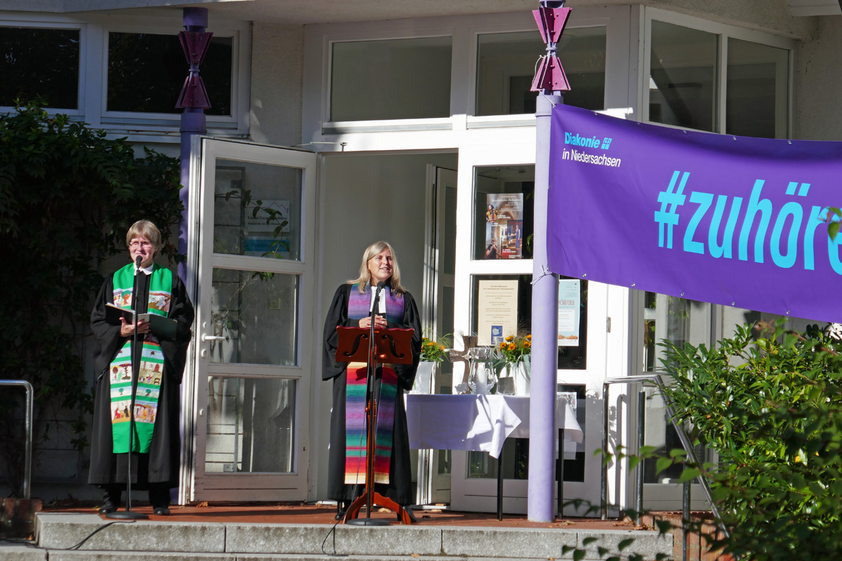 In einer gemeinsamen Predigt schlugen Uta Junginger und Antje Marklein einen Bogen vom Auszug des Volkes Israel aus Ägypten hin zur heutigen Zeit. "Mose bekam von Gott den Auftrag, zum Pharao zu gehen, damit das Volk aus der Sklaverei befreit wird. Er hat ‚100‘ Gründe dagegen vorgebracht, aber Gott ließ nicht locker", erzählte Uta Junginger. Ähnlich sei es in der Diakonie. "Manchmal gibt es kein Zurück, dann muss ich Partei ergreifen, Fürsprecherin werden und nicht Zuschauerin bleiben". Dieses Engagement, zum Beispiel auch für Geflüchtete, kann anstrengend sein. Doch nicht nur das Handeln, auch das Reden, die Stimme zu erheben für die Schwächsten gerade in der Corona-Zeit sei wichtig und auch nicht zu schweigen, wenn ich eine andere Meinung habe, meinte die Superintendentin. Zum Glück - das zeige auch der Auftrag Gottes, der an Mose und seinen Bruder Aaron gehe - stelle Gott uns andere Menschen zur Seite. "Wir können gemeinsam handeln".