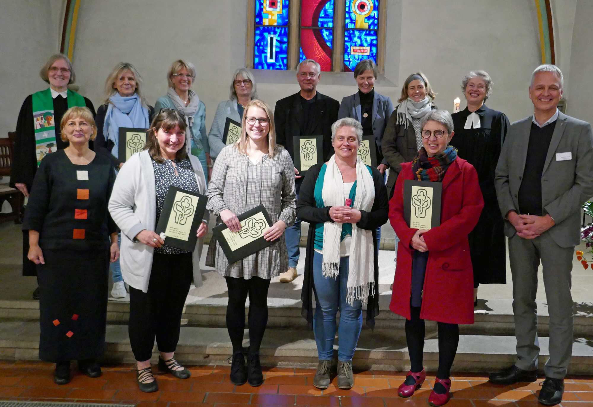 Es gibt einen neuen Besuchsdienst im KRH Klinikum Robert Koch in Gehrden. Über mehrere Monate wurden die zehn Frauen und ein Mann von Diakonin und Krankenhausseelsorgerin Gunhild Junker und Pastorin i.R. Clementine Haupt-Mertens aus Hannover geschult. Zum Abschluss der Ausbildung fand nun ein Einführungsgottesdienst mit Segnung für die Teilnehmerinnen und Teilnehmer statt. „Ihr habt euch auf den Weg gemacht, habt gelernt, wie ihr mit Menschen im Krankenzimmer in Kontakt kommt, wie ihr ein Gespräch beginnt und auch beendet. Ihr seid herzlich empfangen worden im Klinikum und ich freue mich auf weitere Begegnungen mit euch“, sagte Gunhild Junker nun in ihrer Begrüßung in der Margarethenkirche. Denn auch weiterhin seien der Austausch und die Reflexion über die Besuche wichtig. Dies betonte auch Superintendentin Antje Marklein vor der Segnung im Altarraum. „Sie sind nun gut ausgebildet. Wir trauen ihnen diese Aufgabe zu und begleiten sie weiterhin auf ihrem Weg“, erklärte sie. Clementine Haupt-Mertens würdigte in ihrer Predigt die sehr engagierten Kursteilnehmenden, die vertrauensvoll miteinander umgegangen seien und in den Gesprächen auch sich selbst als Person näher gekommen seien. Als Krankenhausseelsorgerin erlebte sie die Klinik auch als Ort der Gottesbegegnung, als Ort von unmittelbaren Begegnungen mit Menschen, die Vertrauen fassen und sich öffnen. „Eine wertschätzende, respektvolle und auch verschwiegene Haltung helfen dabei“, sagte sie.