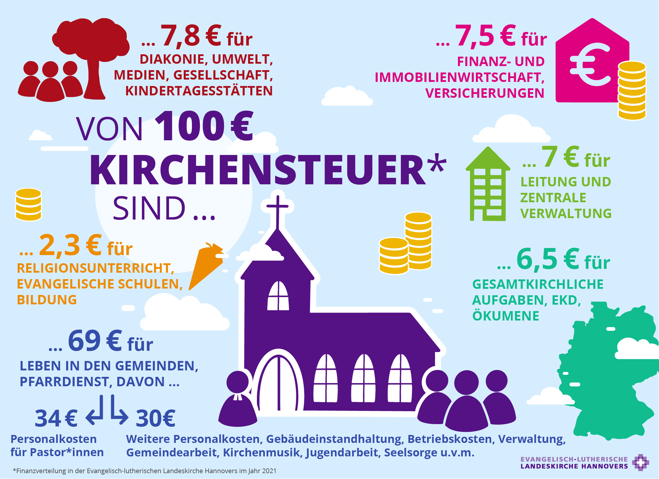 Die Erträge aus Kirchensteuern betrugen in der Landeskirche 2020 587 Millionen Euro (2019: 611,7). Im Haushaltsjahr 2020 schloss das Jahresergebnis der Evangelisch-lutherischen Landeskirche Hannovers dennoch mit einem Verlust von 396 Millionen Euro (2019: Gewinn von 7,1 Millionen) ab. Der Grund sind hohe Versorgungsrückstellungen für die Altersbezüge pensionierter Pastorinnen und Pastoren und Kirchenbeamt*innen.
