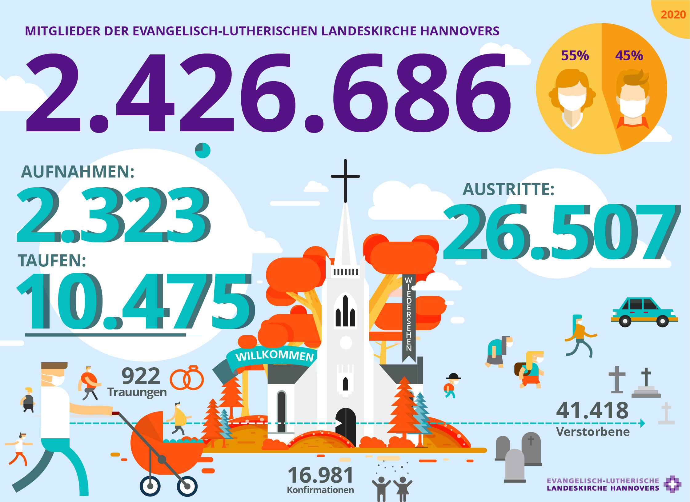 Zum Stichtag 31.12.2020 gehörten 2.426.686 Menschen zur Evangelisch-lutherischen Landeskirche Hannovers. Dies entspricht einem Rückgang von 55.329 Mitgliedern (2 %) gegenüber dem Vorjahr. Im Jahr 2020 sind 41.418 Mitglieder verstorben (2019: 41.412), 26.507 Menschen traten aus der Landeskirche aus (2019: 30.413). Dem gegenüber stehen 10.475 Taufen (2019: 20.179) und 2.323 Aufnahmen (2019: 3.457). Besonders die Zahl der Taufen und Trauungen ist stark beeinflusst von den Maßnahmen zur Eindämmung der Corona-Pandemie. Da Familienfeiern nur in sehr kleinem Rahmen möglich waren und auch die Zahl der Besucher*innen bei Gottesdienst stark beschränkt wurde, sind viele Taufen und Trauungen verständlicherweise auf einen späteren Zeitpunkt verschoben worden. Bei den Konfirmationen sind bereits viele kreative Möglichkeiten entwickelt worden, um in kleinen und größeren Gottesdiensten, Open Air oder in Kirchen oder auch im heimischen Garten die Feier zeitnah nachzuholen. Und gerade finden auch schon wieder viele Taufen und Trauungen statt.