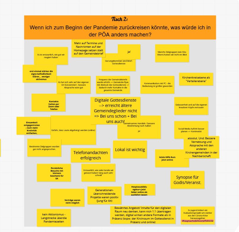 Es folgte ein virtuelles „World-Café“. „Wir sind mit vier Kleingruppen unterwegs und besuchen nach und nach insgesamt vier Tische mit jeweils einer Frage, zu der wir unsere Ideen und Erfahrungen aufschreiben“, erklärte Franziska Bittl das Vorgehen. An einem Tisch stellten die Teilnehmenden vor, was es in ihren Gemeinden an Presse- und Öffentlichkeitsarbeit gibt, am anderen wurde überlegt, was „ich anders machen würde nach den Erfahrungen der Pandemie“, dann wo Schulungsbedarf ist und wie Menschen angesprochen werden können, die mit einer Gemeinde nicht mehr viele Berührungspunkte haben. „Dieses World-Café hat deutlich gemacht, wie aktiv beide Kirchenkreise in dem Bereich sind, aber auch dass es ein großes Interesse an weiteren Schulungen gibt. Seit Beginn der Pandemie sehen wir, wie viele Online-Angebote sehr schnell möglich waren. Aber es wurde auch festgestellt, dass manchmal Absprachen zwischen Nachbargemeinden fehlten und dass Online-Angebote auch viel Zeit beanspruchen“, sagt Sabine Freitag. In einer Abfrage durch Pastorin Kristin Köhler am Ende der Konferenz wurde das Interesse an weiteren Workshops, unter anderem zur Nutzung von Social Media, aber auch zu Datenschutzfragen und anderen Themen deutlich. Das Team mit Nina Rasche, Kristin Köhler, Franziska Bittl, Stephan Schwier und Sabine Freitag, das das Netzwerktreffen vorbereitet hat, zieht ein positives Fazit der Veranstaltung. „Wir sollten diese Zusammenarbeit auf jeden Fall fortsetzen. Es ist kaum zu verstehen, dass wir parallel in beiden Kirchenkreisen einen Ausschuss zum gleichen Thema haben“, so Kristin Köhler.