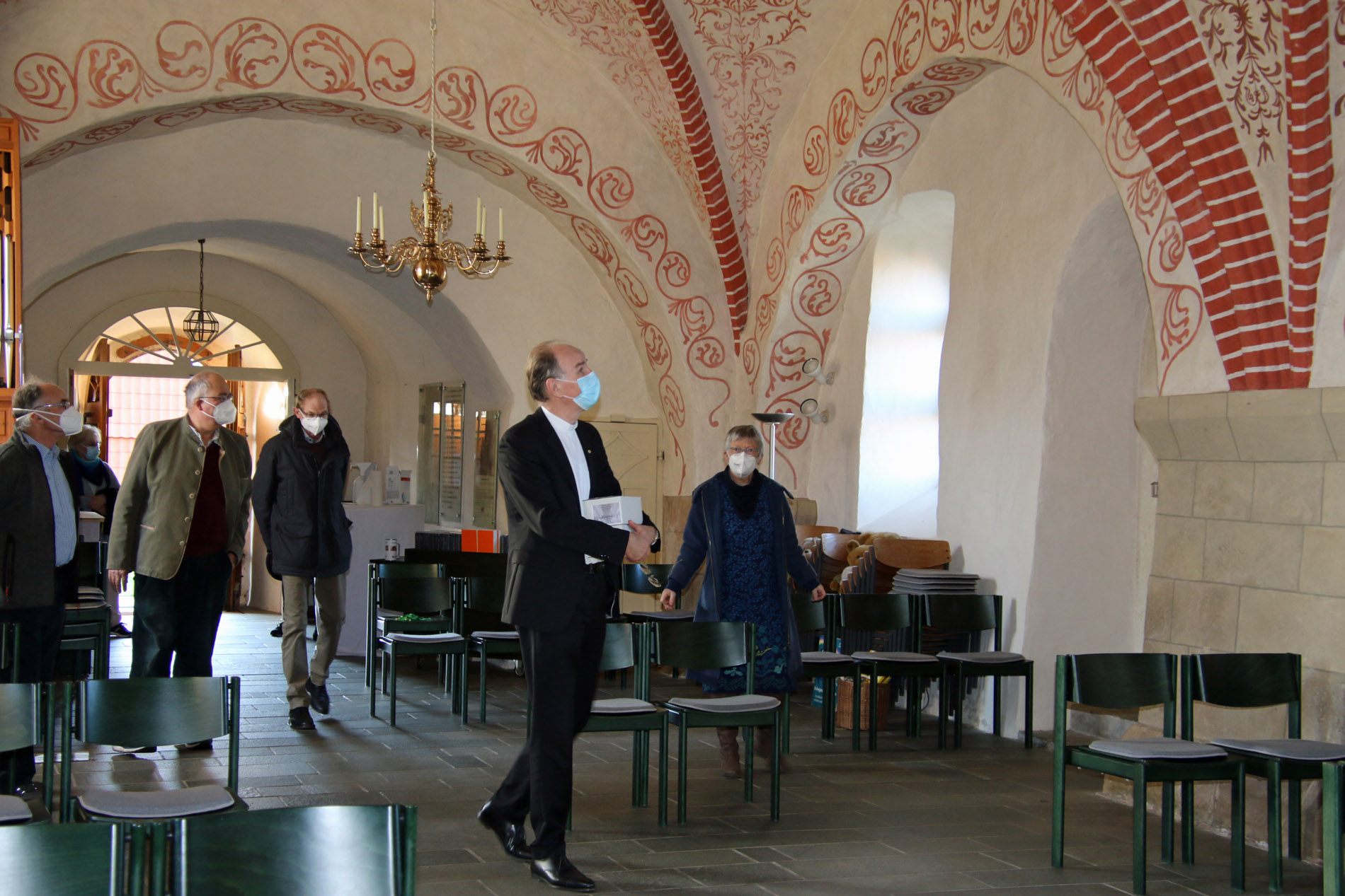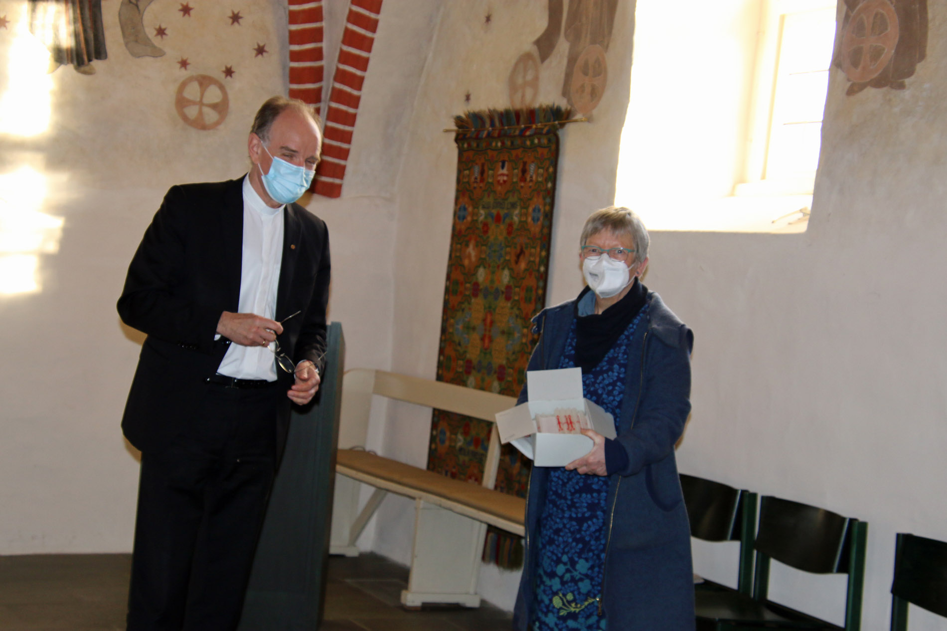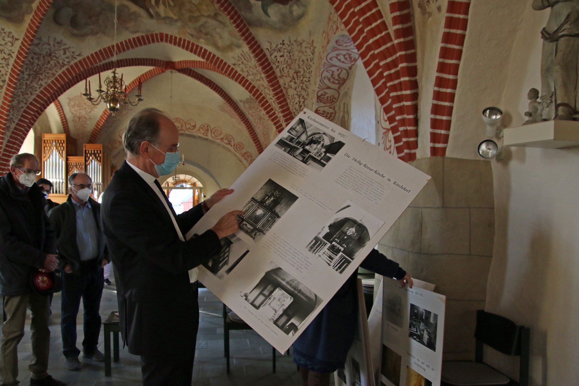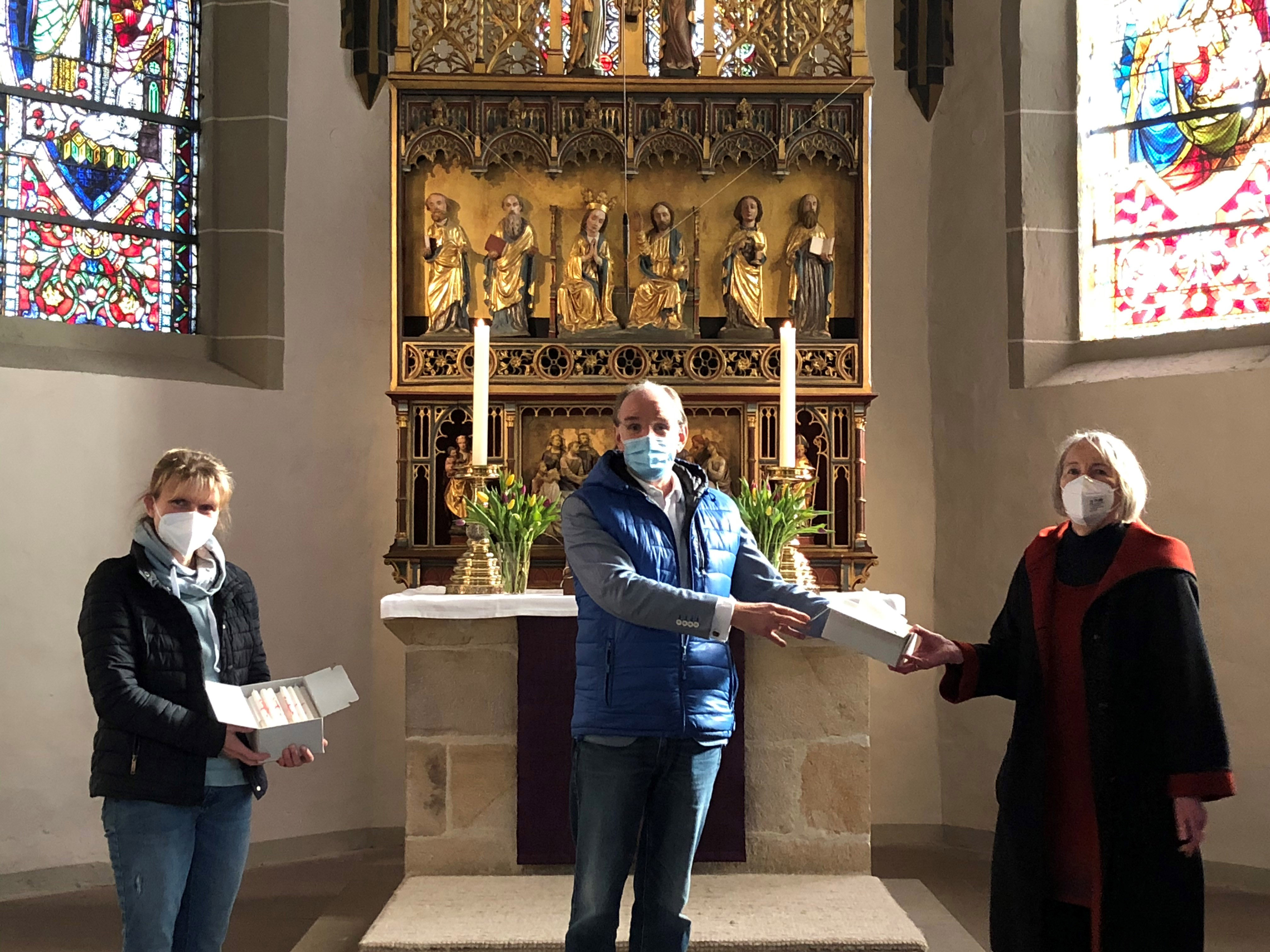 In Kirchdorf im Kirchenkreis Ronnenberg begrüßten am Sonntagnachmittag Kirchenvorsteher*innen, der Patron der Gemeinde Christian von Alten und Pastorin Ute Kalmbach Landesbischof Ralf Meister. Die Reise am Sonntag von einem Ziel zum nächsten war deutlich kürzer, so dass er sich über den geplanten Besuch hinaus Zeit nehmen konnte. So ging er zunächst mit Ute Kalmbach und Kirchenvorsteher Heinz Schlie über das Gelände rund die die Heilig-Kreuz-Kirche in Kirchdorf. Und auch die im 12. Jahrhundert erbaute Kirche faszinierte den Landesbischof. "So schöne Farben", meinte er mit Blick auf das erst in den 1980er Jahren eingebaute Fenster hinter dem Altar. Aber auch die alten Ausmalungen oder auch Gemälde aus den 1920er Jahren wurden von Ralf Meister ausführlich betrachtet. Bei dem großen Interesse, das deutlich wurde, holte Heinz Schlie kurzerhand Ausstellungstafeln aus dem Gemeindehaus, auf denen vor allem die jüngere Geschichte der Kirche dokumentiert wurde. "In den 1980er Jahren gab es eine grundlegende Sanierung und Umgestaltung der Kirche. Damals wurde auch das Fenster geöffnet, die Emporen entfernt und der ganze Boden der Kirche wurde angehoben. Auch die Bänke wurden durch Stühle ersetzt", erzählte Ute Kalmbach. Zum Abschluss des Besuchs überreichte Ralf Meister die 100 Osterkerzen an die Pastorin. "Mir macht diese ganze Aktion sehr viel Spaß. Diese Besuche in den so verschiedenen Kirchen bringen eine große Leichtigkeit des Miteinanders. Lassen sie Lichter leuchten, die Zuversicht und Hoffnung in diese schwierigen Zeiten bringen", sagte er und dankte für das Engagement vor Ort.