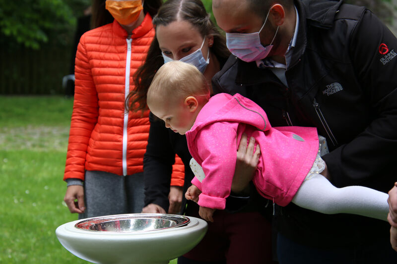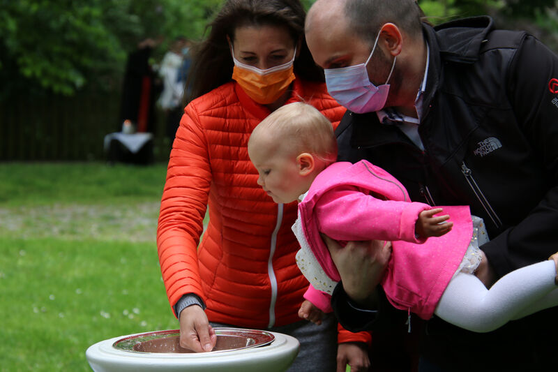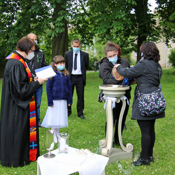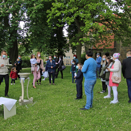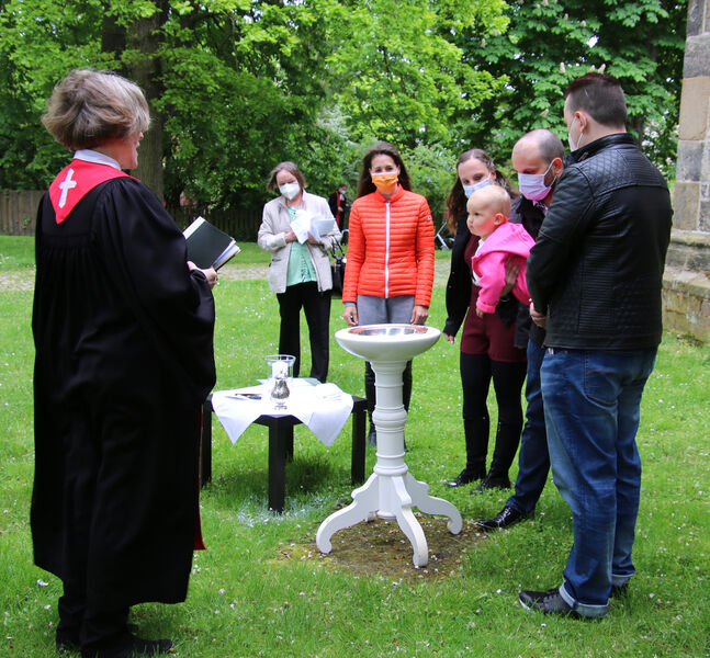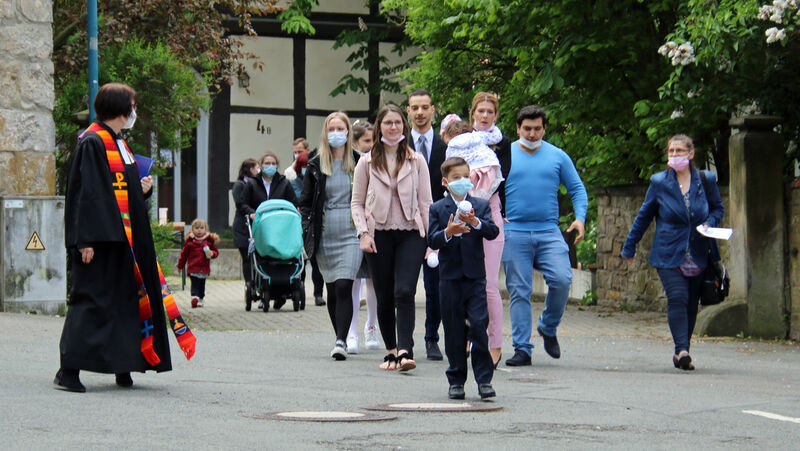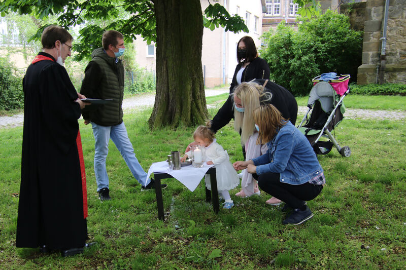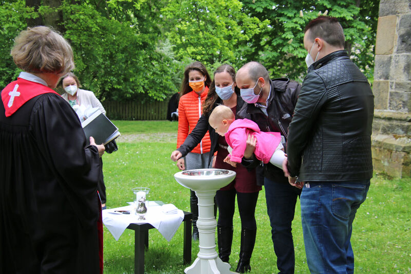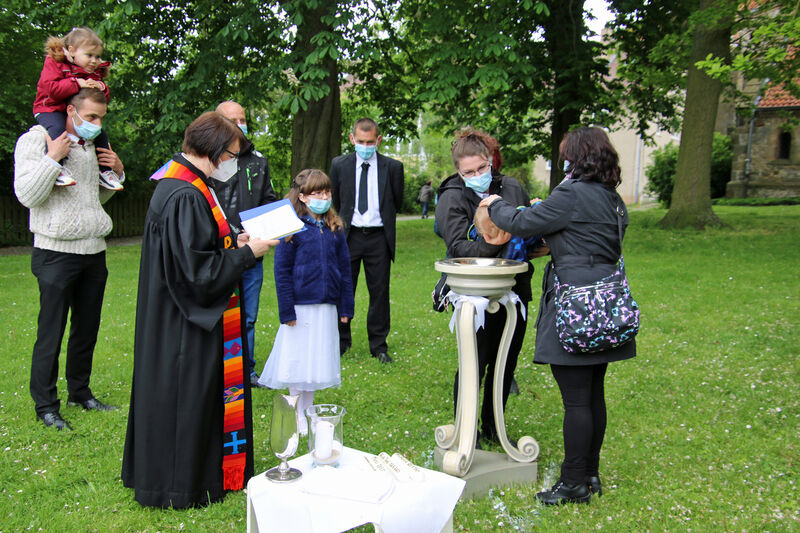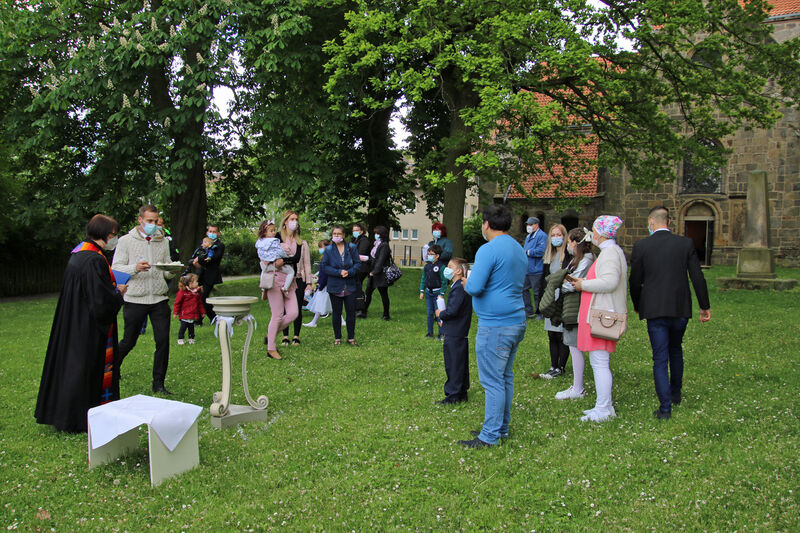 Nachdem im letzten Jahr aufgrund der Corona-Pandemie das für Pfingsten geplante Fest ausfallen musste, waren die Organisator*innen nun froh, dass die Durchführung möglich war. "Für uns gehört das Fest auch mit ins Taufprojekt, das wir zurzeit im Kirchenkreis entwickeln. Nun sind wir zufrieden mit dem Rahmen, in dem wir feiern können, unter freiem Himmel und mit ausreichend Abstand", sagte Pastor Thomas Mayer im Gespräch. Zuvor taufte er die eineinhalbjährige Mila Kostrzewa. Direkt vor der Taufe desinfizierte er die Hände, um dann Mila direkt zu segnen und Wasser auf ihren Kopf zu träufeln. An anderen Taufstationen rund um die Kirche assistierten aber auch Eltern und Paten corona-konform bei der Taufe, so dass nur die direkten Familienangehörigen in Kontakt mit dem Täufling kamen. In der Michaeliskirche taufte Pfarrer Johannes Lim fünf Kinder aus seiner Pfarrgemeinde.