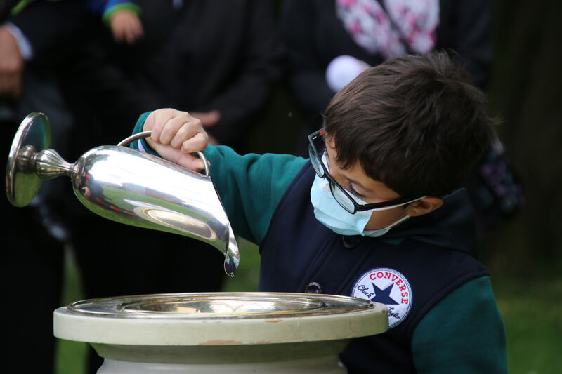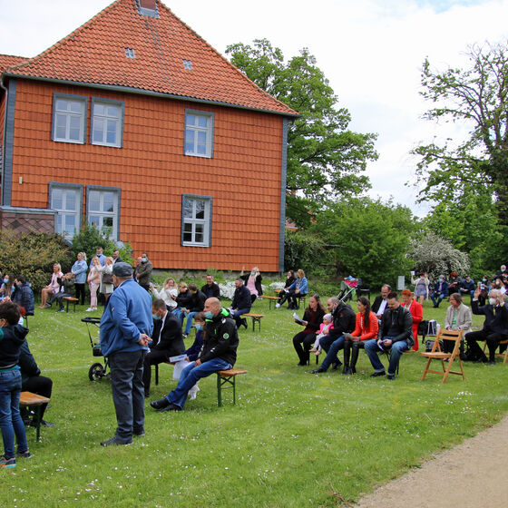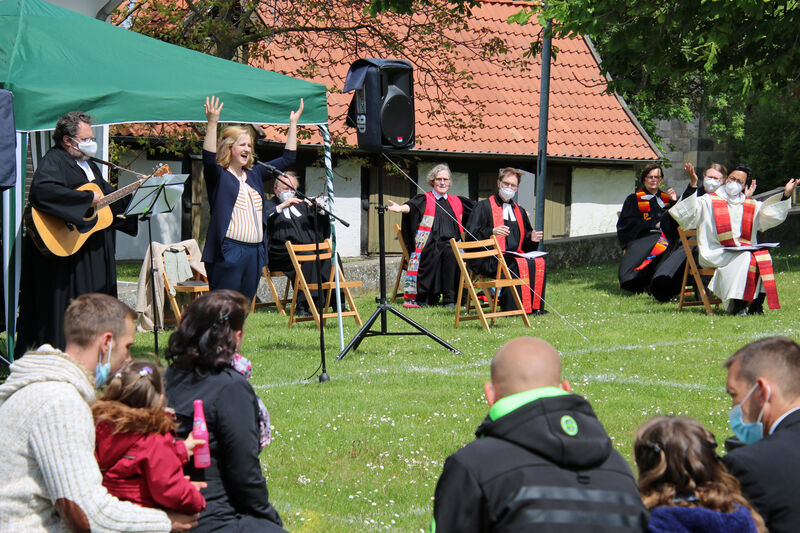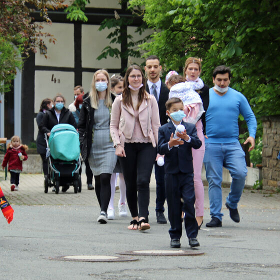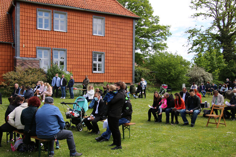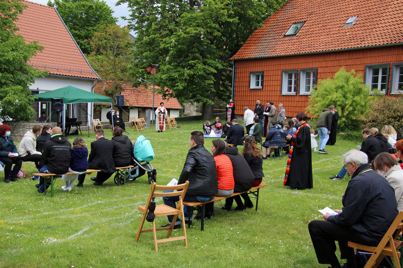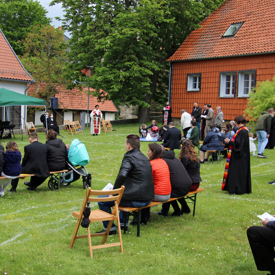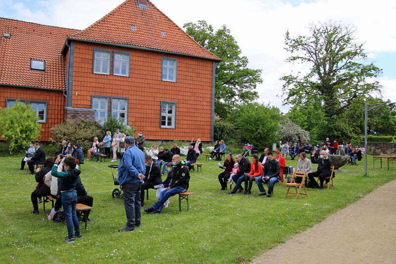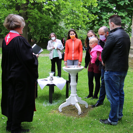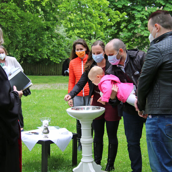 Nachdem im letzten Jahr aufgrund der Corona-Pandemie das für Pfingsten geplante Fest ausfallen musste, waren die Organisator*innen nun froh, dass die Durchführung möglich war. "Für uns gehört das Fest auch mit ins Taufprojekt, das wir zurzeit im Kirchenkreis entwickeln. Nun sind wir zufrieden mit dem Rahmen, in dem wir feiern können, unter freiem Himmel und mit ausreichend Abstand", sagte Pastor Thomas Mayer im Gespräch. Zuvor taufte er die eineinhalbjährige Mila Kostrzewa. Direkt vor der Taufe desinfizierte er die Hände, um dann Mila direkt zu segnen und Wasser auf ihren Kopf zu träufeln. An anderen Taufstationen rund um die Kirche assistierten aber auch Eltern und Paten corona-konform bei der Taufe, so dass nur die direkten Familienangehörigen in Kontakt mit dem Täufling kamen. In der Michaeliskirche taufte Pfarrer Johannes Lim fünf Kinder aus seiner Pfarrgemeinde.
