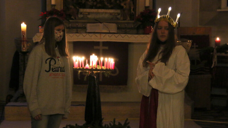 Der Weihnachtszauber ist auch die Gelegenheit für künftige Teamer und Teamerinnen erste Erfahrungen in der Arbeit mit Kindern zu machen. Die neun Jugendlichen haben alle in den Herbstferien an der Juleica-Schulung des Kirchenkreisjugenddienstes teilgenommen und machen nun ein Praktikum. Außerdem gehörte die FSFlerin der Gemeinde, Marie Rohwedder zum Team, die in die Rolle der Lucia schlüpfte.