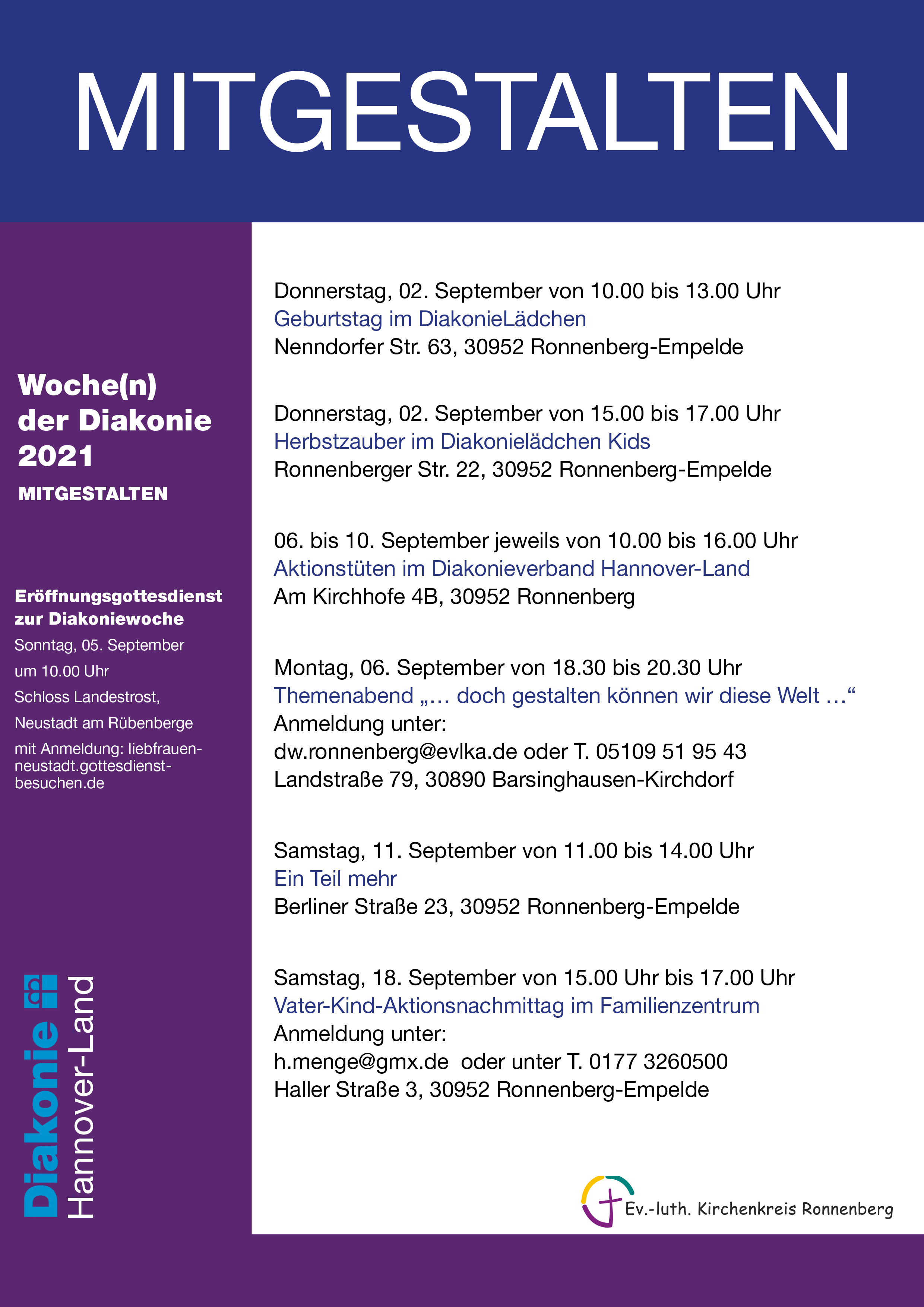 Für den Kirchenkreis Ronnenberg bereiten Mitglieder des Diakonieausschusses, Diakoniebeauftragte und andere zusammen mit Kirchenkreissozialarbeiterin Andrea Schink ein abwechslungsreiches Programm vor. In den Woche(n) der Diakonie werden verschiedene Gottesdienste gefeiert. Und sogar schon im August sind Gäste nach Wettbergen zu einem Filmnachmittag eingeladen.