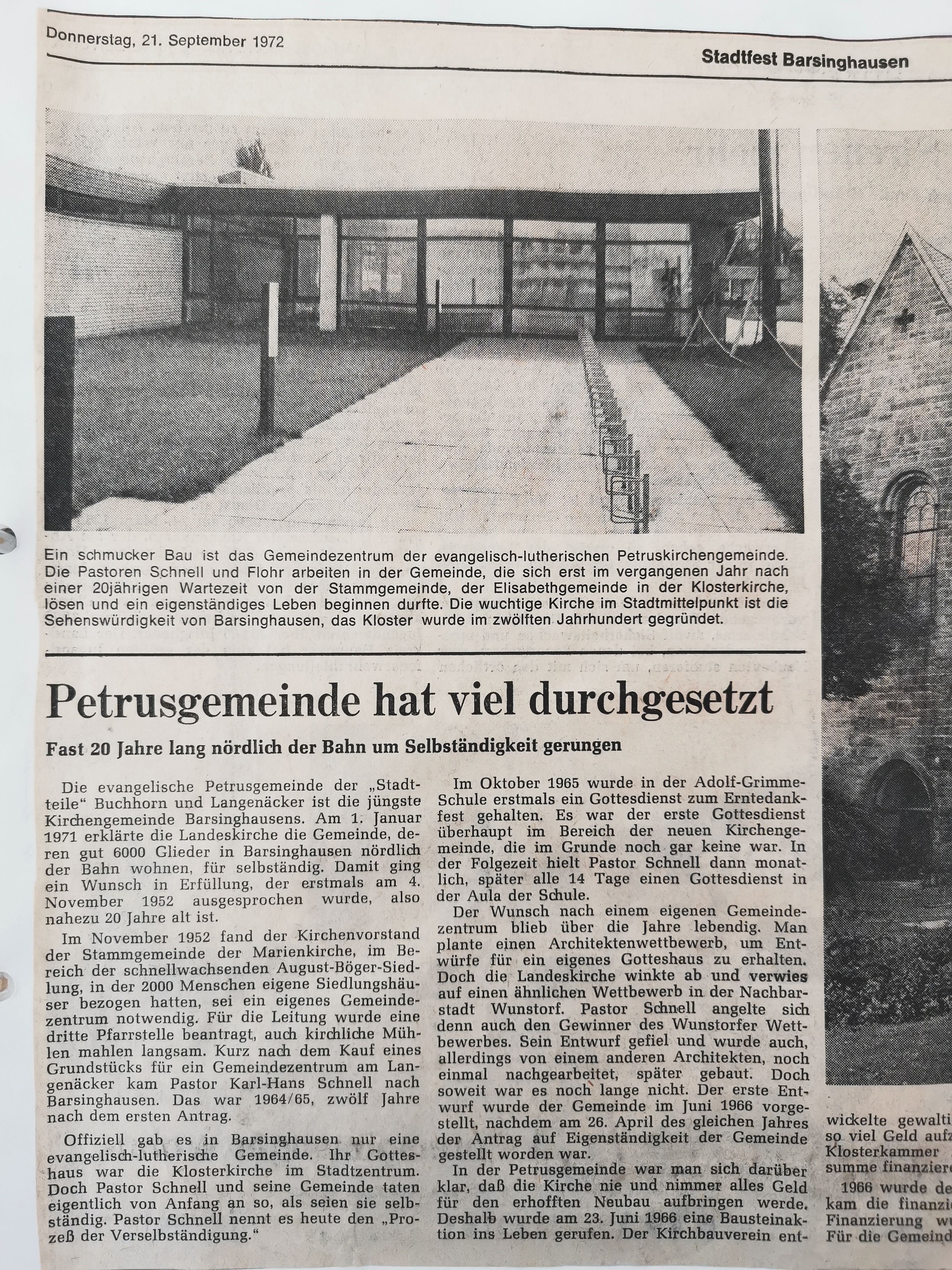 Pastor Schnell trat seinen Dienst auf der 2. Pfarrstelle der Mariengemeinde am 1. Mai 1965 an. Zu seinen Aufgaben gehörte der Aufbau einer neuen Kirchengemeinde im Nordbezirk. Keine leichte Aufgabe: Wie sollte der Kontakt zu den Menschen nördlich der Bahn hergestellt werden? Pastor Schnell lud beim Erntedankgottesdienst 1965 ein zu einem „Gespräch zwischen Pastor und Gemeinde“. Er wollte erfahren, was gebraucht wird, wie sich die Menschen die neue Kirchengemeinde wünschen.